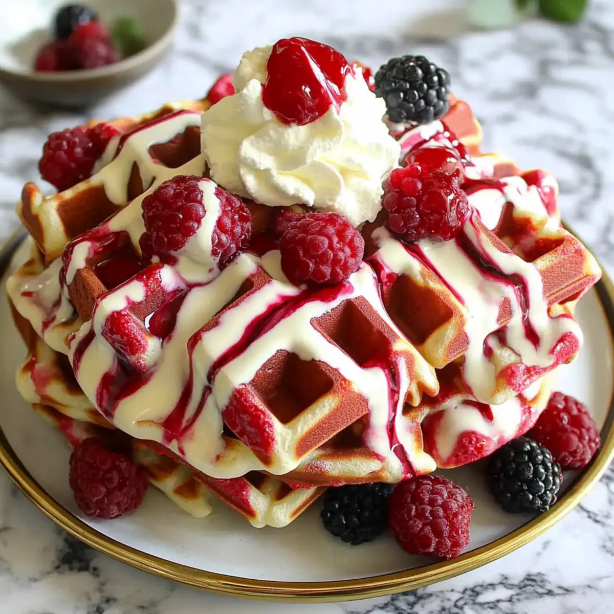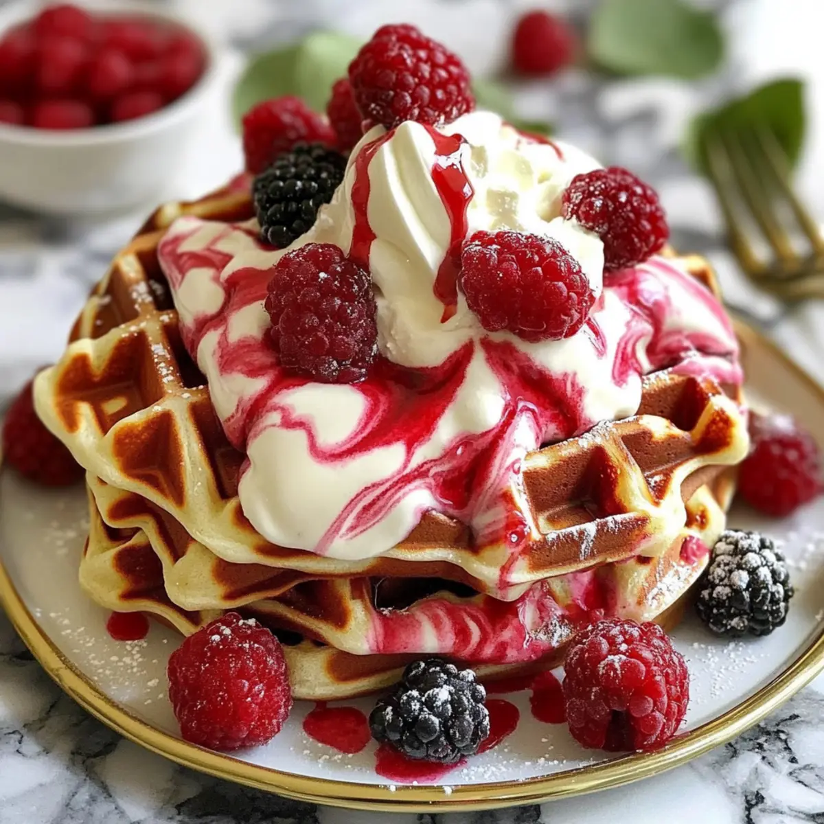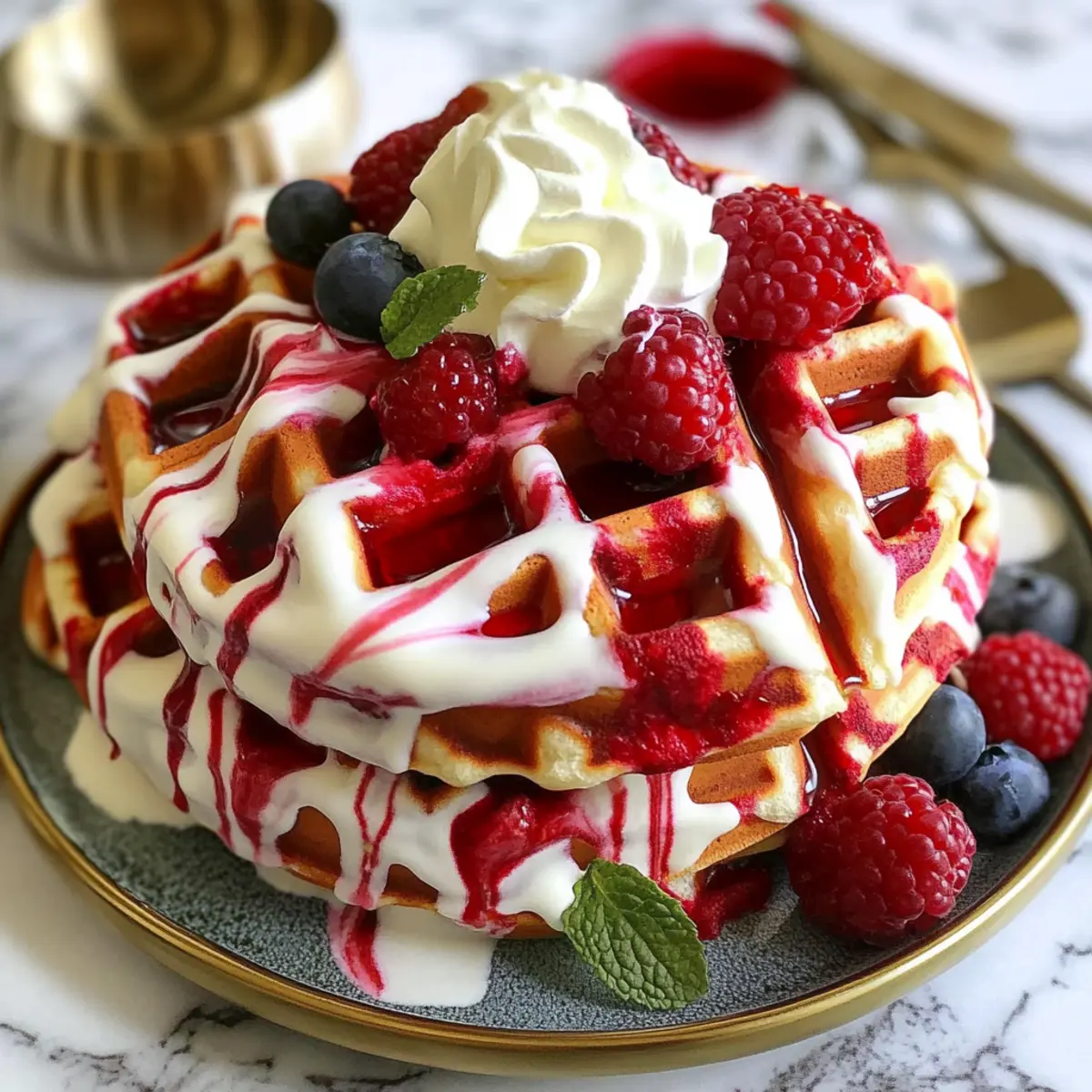 The sizzling sound of batter hitting the hot waffle iron filled the kitchen as I prepared to transform breakfast into a vibrant celebration. Today’s star is none other than the tantalizing Red Velvet Marble Waffles, a dazzling fusion of rich red velvet and fluffy classic waffles. These beauties aren’t just a feast for the eyes; they’re light, airy, and the perfect mix of sweetness to elevate any morning meal or brunch gathering. Imagine treating your loved ones to a plate of these stunning waffles, effortlessly impressing them without spending hours in the kitchen! Whether you’re enjoying them with a drizzle of maple syrup or piled high with fresh berries, these waffles guarantee smiles all around. Want to discover the secret to achieving that gorgeous marbled effect? Keep scrolling! Why Are Red Velvet Marble Waffles a Must-Try? Visual Appeal: The stunning marbled pattern will make your breakfast table shine, turning an ordinary morning into a festive occasion. Fluffy Texture: Light and airy, these waffles offer a delightful mouthfeel that perfectly complements their unique flavor profile. Versatile Toppings: Enjoy them simply with maple syrup or elevate their charm with whipped cream and fresh berries. The options are endless! Easy to Make: With straightforward preparation steps, you can whip these up in no time, freeing you to enjoy brunch with friends or family. Celebratory Treat: Perfect for special occasions or just satisfying your sweet tooth, these waffles deliver on both taste and style. Curious about more delicious breakfast ideas? Check out my S’mores Hand Pies for another crowd-pleaser that combines fun and flavor! Red Velvet Marble Waffle Ingredients • Get ready to whip up these delightful Red Velvet Marble Waffles! For the Classic Waffle Batter: All-purpose flour – Provides structure; substitute with whole wheat flour for a healthier option. Sugar – Adds just the right sweetness; can be reduced if preferred. Baking powder – Acts as a leavening agent for that fluffy texture; no known substitutions. Baking soda – Enhances browning; remember it requires an acid to activate. Salt – Boosts flavor; can be reduced for those monitoring sodium intake. Buttermilk – Adds moisture and richness; substitute with regular milk or a dairy-free alternative mixed with vinegar. Large eggs – Binds the ingredients together and adds a touch of richness; use flax eggs for a vegan alternative. Melted butter – Offers a creamy richness; feel free to substitute with vegetable oil or a dairy-free alternative. Vanilla extract – Enhances flavor; optional but highly recommended; try almond extract for a twist. For the Red Velvet Batter: All-purpose flour – Functions as the structure; substitute with a gluten-free flour blend if needed. Cocoa powder – Adds depth and flavor; make sure to use unsweetened, with no substitutions necessary. Sugar – Contributes sweetness; reduce for a lighter option. Baking powder – Works as a leavening agent; no known replacements exist. Baking soda – Promotes browning; ensure it’s combined with an acid for the best results. Salt – Heightens flavor; can be cut back for those on a low-sodium diet. Buttermilk – Infuses moisture and flavor; regular milk or a dairy-free substitute mixed with vinegar works in a pinch. Large egg – Binds the batter; a flax egg can serve as a great vegan substitute. Melted butter – Adds richness; you can swap this with vegetable oil or a dairy-free replacement. Vanilla extract – Elevates flavor; interchangeable with other extracts if desired. Red food coloring – Provides the signature red hue; feel free to omit it for uncolored waffles or replace it with beet juice for a natural touch. Step‑by‑Step Instructions for Red Velvet Marble Waffles Step 1: Prepare the Classic Waffle Batter In a large mixing bowl, whisk together 2 cups of all-purpose flour, 2 tablespoons of sugar, 1 tablespoon of baking powder, 1 teaspoon of baking soda, and ½ teaspoon of salt. In a separate bowl, combine 1¾ cups of buttermilk, 2 large eggs, ½ cup of melted butter, and 1 teaspoon of vanilla extract. Gradually mix the wet ingredients into the dry ingredients until just combined, ensuring not to overmix for fluffy Red Velvet Marble Waffles. Step 2: Prepare the Red Velvet Batter In another bowl, whisk together 1¾ cups of all-purpose flour, 2 tablespoons of cocoa powder, 1 cup of sugar, 1 tablespoon of baking powder, 1 teaspoon of baking soda, and ½ teaspoon of salt. In a separate bowl, blend 1¾ cups of buttermilk, 1 large egg, ½ cup of melted butter, 1 teaspoon of vanilla extract, and 2 tablespoons of red food coloring. Combine the wet and dry mixtures until just mixed, preserving the vibrant color without overworking the batter. Step 3: Preheat Waffle Iron While preparing the batters, preheat your waffle iron according to the manufacturer’s instructions. This typically takes about 5 minutes. Ensure it’s heated enough to produce the perfect crispy exterior when you pour in the batter. A properly preheated waffle iron is essential for achieving that golden-brown finish and fluffy interior for your Red Velvet Marble Waffles. Step 4: Create the Marbled Effect Once your waffle iron is ready, lightly grease it with non-stick spray or melted butter. Begin by pouring a small amount of the classic waffle batter onto one side of the iron, followed by a scoop of the red velvet batter on the other side. Use a toothpick or knife to gently swirl the two colors together, creating a beautiful marbled pattern without fully mixing them. Step 5: Cook the Waffles Close the waffle iron and cook according to the manufacturer’s guidelines, usually around 4-6 minutes. Look for a golden brown color on the outside and ensure that the waffles are cooked through before removing them. This step is crucial for achieving perfect Red Velvet Marble Waffles that are both tender and visually stunning. Step 6: Serve Once cooked, carefully remove 