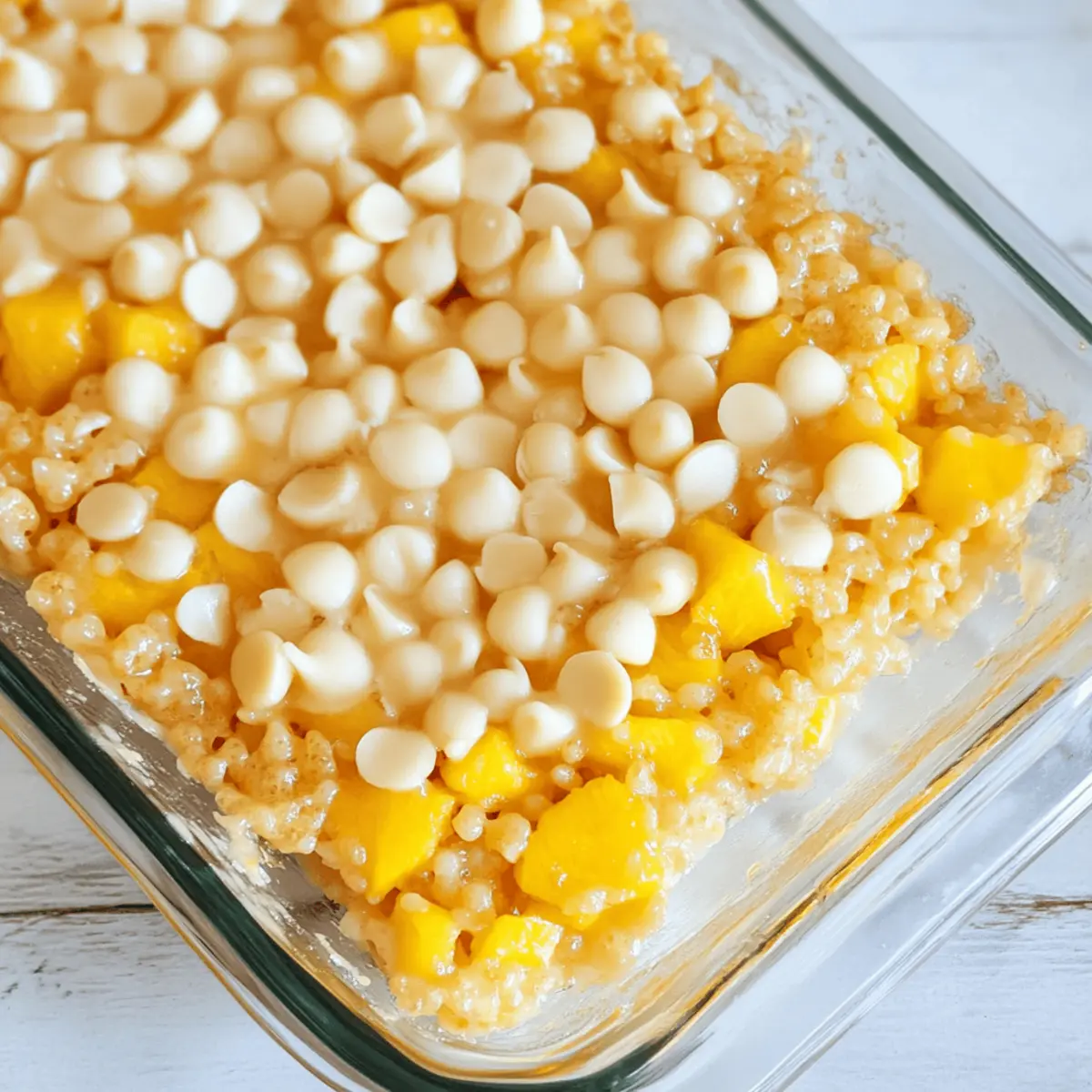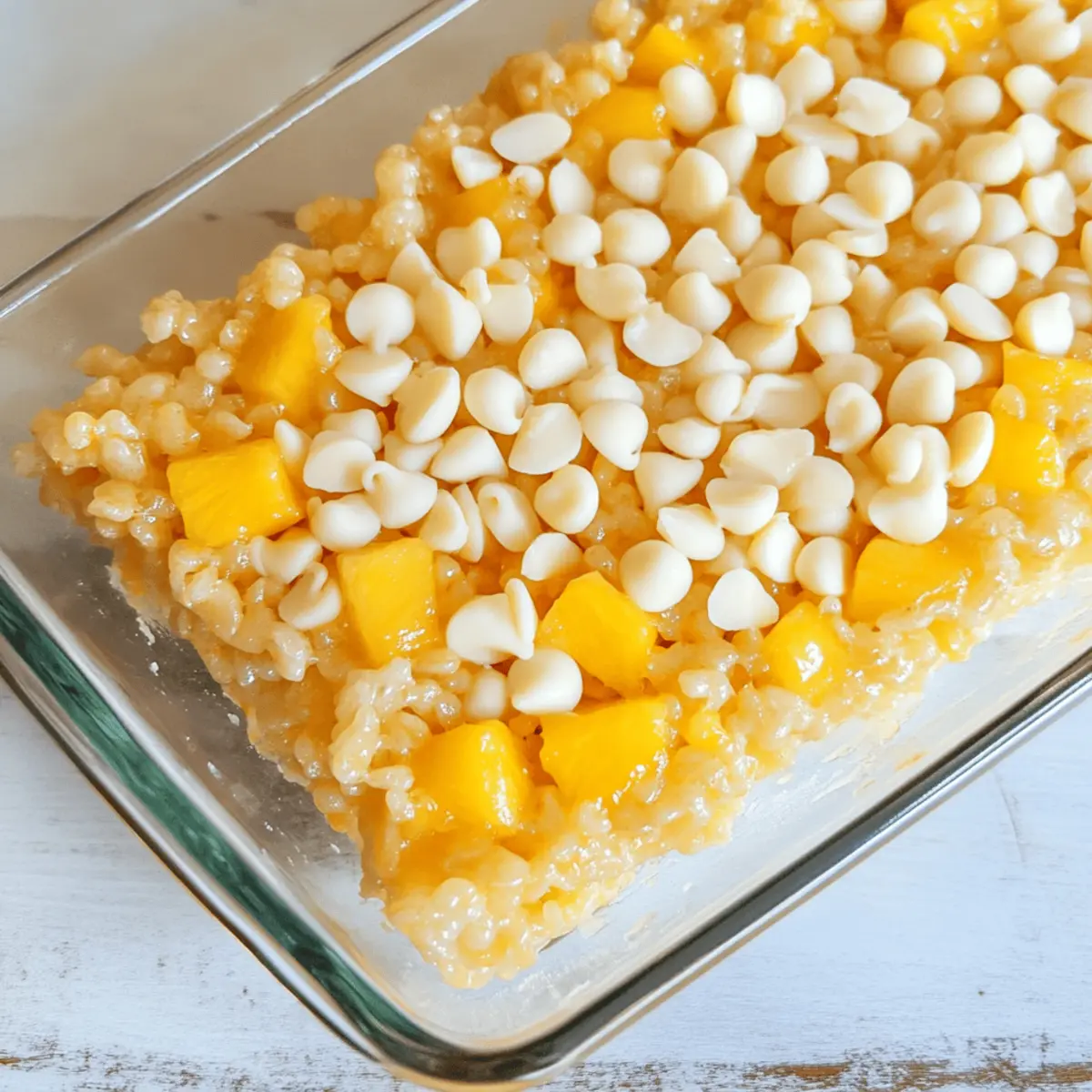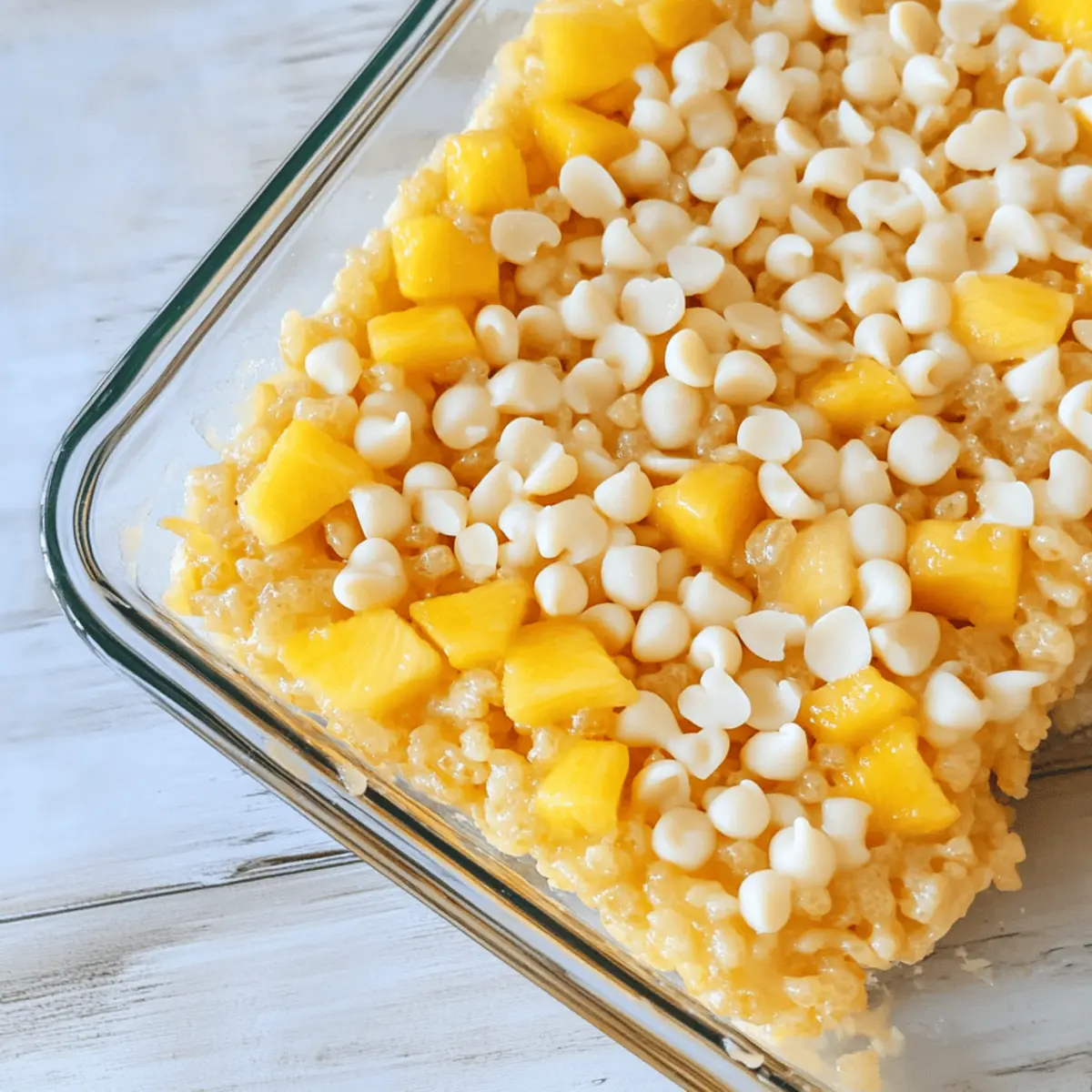 As I unwrapped a package of marshmallows the other day, the sweet aroma transported me straight to the beaches of Hawaii. You know that moment when you crave something comforting yet adventurous? That’s where these Tropical Hawaiian Rice Krispie Treats come into play! By blending the classic crunchy goodness of Rice Krispies with creamy white chocolate, nutty macadamia nuts, and a luscious mango glaze, this recipe promises to be a crowd-pleaser at any gathering. Not only do they exude a festive spirit, but they’re also incredibly easy to whip up—perfect for busy weeknights or spontaneous get-togethers. So, are you ready to embark on a delightful tropical treat that’ll have your friends begging for seconds? Let’s dive into this fun recipe together! Why are Rice Krispie Treats so irresistible? Crowd-Pleaser: These Tropical Rice Krispie Treats are a sure hit that will leave your guests raving about your culinary skills. Vibrant Flavors: The combination of mango, white chocolate, and macadamia nuts creates an explosion of tropical flavors that dance delightfully on your palate. Quick and Easy: With just a few simple steps, you can prepare these treats in no time, making them perfect for last-minute events or cozy family nights. Versatile Options: Feel free to switch up the fruit puree or add toasted coconut flakes for a unique twist that suits your taste. Gooey Goodness: The mix of crunchy Rice Krispies and creamy toppings offers a satisfying texture that’s both comforting and indulgent. Perfect for Any Occasion: Whether it’s a luau-themed party, picnic, or just a sweet treat at home, these bars bring a festive spirit to any gathering. Rice Krispie Treats Ingredients For the Treats Butter – Adds richness and flavor; for the best results, use unsalted butter. Marshmallows – Provide sweetness and the signature gooey texture; mini marshmallows melt more easily. Vanilla – Enhances sweetness and aroma; opt for pure vanilla extract for a deeper flavor. Rice Krispies – The main structure and crunch of the treat; other cereals can be substituted, but the texture may differ. Chopped Macadamia Nuts – Offer a buttery crunch; peanuts or almonds can serve as nut-free alternatives. White Chocolate Chips – Add sweetness and creaminess; semi-sweet or dark chocolate chips can provide a richer taste. For the Mango Glaze Mango Puree – Infuses tropical flavor and vibrant color; feel free to substitute with pineapple or peach puree. Salt – Enhances overall flavors; just a pinch will do! Powdered Sugar – Used in the glaze to achieve desired sweetness and consistency; adjust to taste. These ingredients come together to create delicious Rice Krispie Treats with a tropical twist, perfect for any occasion! Step‑by‑Step Instructions for Tropical Hawaiian Rice Krispie Treats with Mango and White Chocolate Step 1: Prep the Pan Begin by spraying a 9×13 inch baking pan with nonstick spray to prevent sticking. Make sure to cover the entire surface evenly for easy removal later. Set the pan aside while you work on melting the other ingredients—this is an important first step for a successful batch of Rice Krispie Treats. Step 2: Melt Ingredients In a large saucepan, melt 4 tablespoons of unsalted butter over low heat. Stir it gently until fully melted, then add 10 ounces of mini marshmallows and keep stirring until they melt into a gooey mixture. Incorporate 1 teaspoon of pure vanilla extract for added flavor, ensuring everything is well combined and glossy. Step 3: Combine with Rice Krispies Once the marshmallow mixture is smooth and creamy, remove it from heat and immediately fold in 6 cups of Rice Krispies cereal. Use a spatula to gently mix until each Rice Krispie is completely coated in the gooey marshmallow mix. The texture should become thick and sticky, indicating it’s ready for the next step. Step 4: Transfer to Pan Pour the Rice Krispie mixture into the prepared pan. Using wax paper, press down firmly and evenly to flatten the mixture into all corners of the pan. This ensures that your Tropical Hawaiian Rice Krispie Treats will set evenly and maintain their shape once cut into bars. Step 5: Add Toppings While the mixture is still warm, sprinkle 1 cup of chopped macadamia nuts and 1 cup of white chocolate chips on top. Gently press them into the mixture with your hands or the wax paper, ensuring they stick and are distributed evenly for a burst of flavor in every bite. Step 6: Make the Glaze In a small bowl, whisk together 1 cup of mango puree, 2 tablespoons of melted butter, a pinch of salt, and 1 cup of powdered sugar. Mix until the glaze is smooth and has a drizzle-friendly consistency. The vibrant color and tropical aroma will infuse your treats with an exciting flavor profile. Step 7: Set and Serve Drizzle the mango glaze over the set Rice Krispie layer, allowing it to cascade beautifully. Let the entire pan set at room temperature for at least one hour, allowing the flavors to meld. Once set, cut into bars and serve your delightful Tropical Hawaiian Rice Krispie Treats at gatherings or special occasions! Expert Tips for Tropical Rice Krispie Treats Quick Assembly: Work swiftly when adding toppings; the marshmallow mixture cools and firms up quickly. Aim to complete this step within a few minutes. Use Wax Paper: Press down the mixture using wax paper to ensure an even and smooth surface, which also prevents sticking to your hands. Adjust Glaze Thickness: Feel free to modify the powdered sugar in the mango glaze to achieve your desired sweetness and consistency, enhancing your Rice Krispie Treats. Alternative Toppings: Experiment with different toppings like toasted coconut or additional fruit purees to truly make these treats your own and cater to diverse tastes. Storage Secrets: Keep your treats fresh by storing them in an airtight container at room temperature for up to a week, ensuring they’re ready for spontaneous cravings. Rice Krispie Treats Variations Explore t