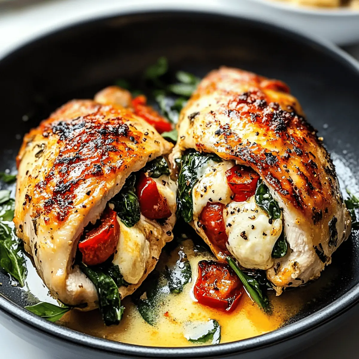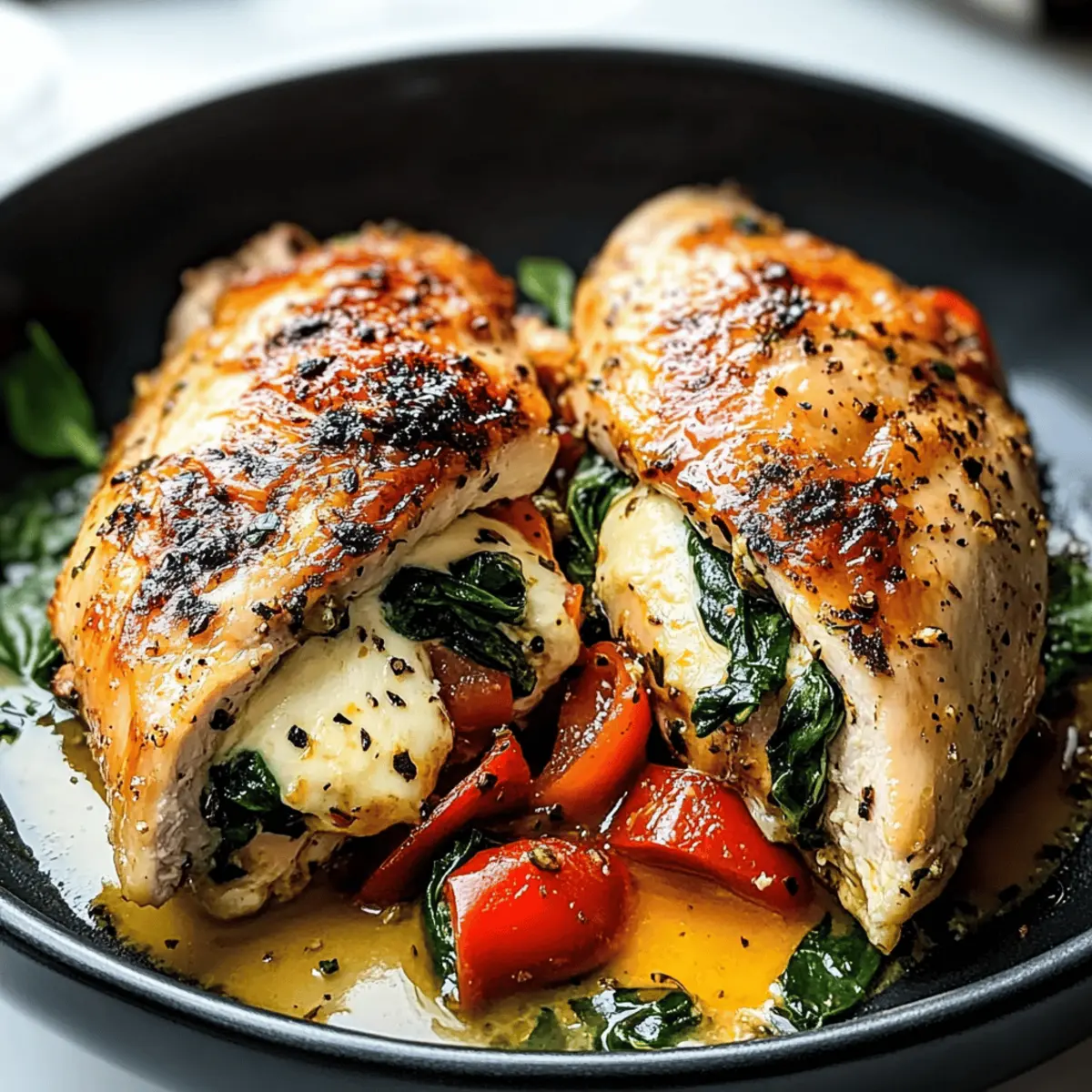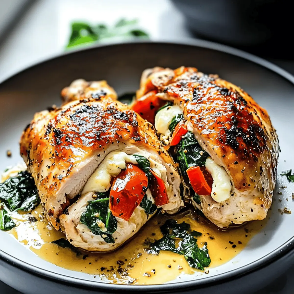 As I stood in my kitchen, glancing over the vibrant array of ingredients, I felt a wave of excitement wash over me. It’s amazing how simple chicken breasts can be elevated to something truly gourmet with just a few flavorful companions. Enter Roasted Red Pepper, Spinach, and Mozzarella Stuffed Chicken! This dish transforms a weeknight meal into a culinary experience, boasting a perfect balance of wholesome veggies and gooey cheese that pleases everyone at the table. Not only is it packed with protein, making it ideal for a nourishing dinner, but it also comes together in just an hour, allowing for memorable moments without the fuss. Ready to impress your family with a dish that feels indulgent yet comforting? Let’s dive into this fantastic recipe! Why Will You Love This Dish? Gourmet Experience: Take your weeknight dinners to the next level with this stunning recipe that feels like dining out! Flavor Explosion: The savory blend of roasted red peppers, sautéed spinach, and melty mozzarella delivers a mouthwatering taste sensation that your family will adore. Quick & Easy: In just one hour, you can create an impressive dish suitable for any occasion. It’s ideal for busy weeknights when you still crave something special. Nutritional Powerhouse: Packed with protein and fresh vegetables, this meal is not only delicious but also nutritious, making it perfect for health-conscious eaters. Impressive Presentation: The golden-brown exterior and vibrant filling make this stuffed chicken a visual feast—great for impressing guests or making your family feel special! For more delicious dinner ideas, try these Chicken Alfredo Sloppy or Chicken Caesar Croissant recipes! Roasted Red Pepper, Spinach, and Mozzarella Stuffed Chicken Ingredients For the Chicken • Chicken Breasts – Tender and lean base; ensure they’re skinless and boneless for even cooking. For the Filling • Roasted Red Peppers – Sweet and smoky; add vibrant color and depth—substitute with jarred roasted peppers if fresh aren’t available. • Spinach – Earthy flavor that wilts down, enhancing nutrition; fresh or baby kale can be used as a substitute. • Mozzarella Cheese – Creamy goodness that promotes gooeyness when melted; can be replaced with shredded mozzarella or provolone. • Parmesan Cheese – Nutty flavor that complements mozzarella and enhances texture. For Cooking • Olive Oil – Essential for sautéing and creating a golden crust. • Garlic – Offers essential flavor; fresh minced garlic is preferred. For Seasoning • Oregano and Basil – Fragrant Mediterranean herbs that add a slightly sweet note; use fresh herbs for better taste. • Salt and Pepper – Essential seasonings to elevate flavors. For an Extra Touch • Balsamic Vinegar – Optional drizzle for added tanginess to finish your dish beautifully. This Roasted Red Pepper, Spinach, and Mozzarella Stuffed Chicken will not only feed your family but also warm their hearts with every bite! Step‑by‑Step Instructions for Roasted Red Pepper, Spinach, and Mozzarella Stuffed Chicken Step 1: Preheat the Oven Begin by preheating your oven to 375°F (190°C). This ensures that your Roasted Red Pepper, Spinach, and Mozzarella Stuffed Chicken will cook evenly and develop that beautiful golden-brown exterior. While the oven heats, gather your ingredients and prepare your workspace for the delightful cooking ahead. Step 2: Prepare the Chicken Take your skinless, boneless chicken breasts and carefully cut a pocket in each one, making sure not to slice all the way through. The pocket needs to be spacious enough to hold the filling, so take your time. Once prepared, season the chicken with a pinch of salt and pepper for an extra flavor boost as you assemble the filling. Step 3: Sauté Garlic and Spinach In a large skillet over medium heat, add a drizzle of olive oil. Once the oil is shimmering, toss in minced garlic and sauté for about 30 seconds until fragrant. Next, add fresh spinach to the skillet, stirring continuously until it wilts down and reduces in volume, roughly 2-3 minutes. This step enhances the flavor and integrates the earthy goodness into your filling. Step 4: Mix Filling In a mixing bowl, combine the sautéed spinach, roasted red peppers, mozzarella, Parmesan cheese, oregano, basil, and a sprinkle of salt and pepper. Stir until all the ingredients are well-mixed, and you have a vibrant and creamy filling for your Roasted Red Pepper, Spinach, and Mozzarella Stuffed Chicken. This blend is rich in color and flavor, perfect for stuffing the chicken. Step 5: Stuff the Chicken Now, take the prepared chicken breasts and carefully fill each pocket with the hearty mixture, ensuring they’re well-stuffed but not overfilled to prevent leakage during cooking. Use toothpicks to secure the openings if necessary. This step is key to ensuring the filling stays put and the flavors meld together beautifully while cooking. Step 6: Sear the Chicken Heat your skillet over medium-high heat again, adding a bit more olive oil. Once hot, gently place the stuffed chicken breasts into the pan. Sear each side for about 2-3 minutes or until they achieve a lovely golden-brown crust. This not only locks in moisture but also creates an enticing flavor profile for your Roasted Red Pepper, Spinach, and Mozzarella Stuffed Chicken. Step 7: Bake the Chicken Transfer the seared chicken breasts to a baking dish and place them in the preheated oven. Bake for 20-25 minutes, or until the internal temperature reaches 165°F (74°C) and the chicken is no longer pink in the center. This ensures that your stuffed chicken is cooked perfectly, allowing all the delicious flavors to harmonize together. Step 8: Serve the Chicken Once baked, remove the Roasted Red Pepper, Spinach, and Mozzarella Stuffed Chicken from the oven and let it rest for about 5 minutes. If desired, drizzle a little balsamic vinegar on top before slicing into the chicken. This step enhances the presentation and