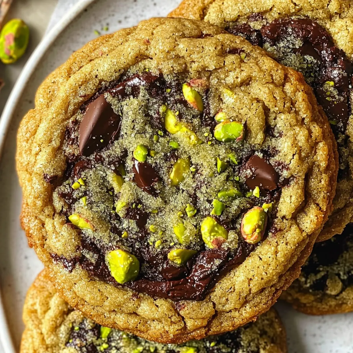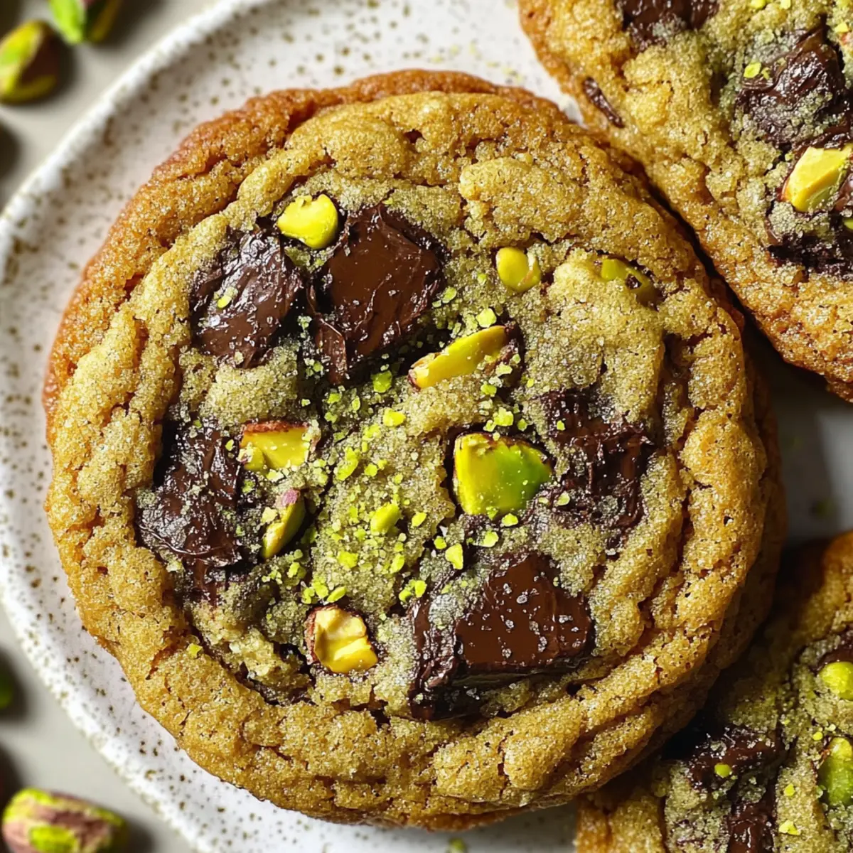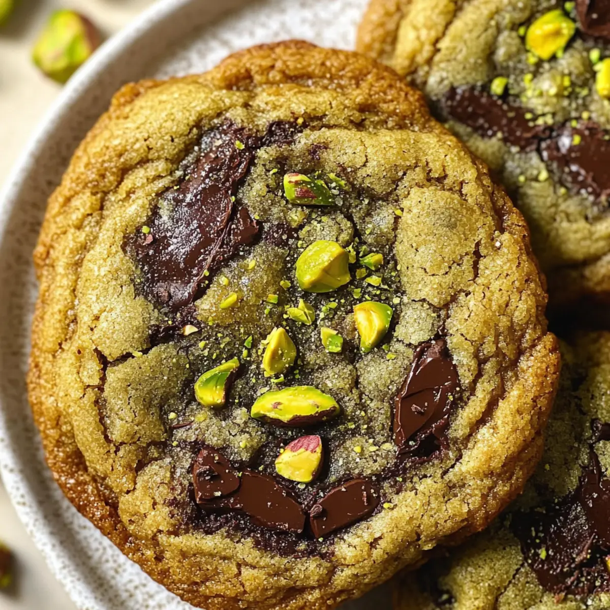 As the aroma of freshly baked cookies wafts through my kitchen, I can’t help but smile, especially when it’s from a batch of Salted Pistachio Chocolate Chunk Cookies. The delightful combination of rich dark chocolate and crunchy roasted pistachios transforms an ordinary treat into an extraordinary indulgence. These cookies are not just a joy to make—they’re a wonderful way to impress family and friends with a homemade dessert that’s also vegetarian-friendly. With quick prep and easy steps, you’ll find whipping up these cookies an enjoyable baking adventure. So why not take a break from fast food and dive into this scrumptious recipe? Your kitchen (and taste buds) will thank you! Curious about how to achieve that perfect chewy texture? Let’s get started! Why Are These Cookies So Irresistible? Gourmet Delight: The combination of dark chocolate chunks and roasted salted pistachios elevates your cookie experience to gourmet status. Simple to Make: Even novice bakers can whip these up with ease, thanks to straightforward steps and common ingredients. Crowd-Pleasing Treat: These cookies make a memorable impression at gatherings—everyone will be clamoring for the recipe! Rich Flavor: Enjoy the delightful contrast of sweet chocolate and nutty pistachios, with a hint of almond aroma adding complexity. Flexible Recipe: Feel free to swap out ingredients like the pistachios or chocolate types to suit your tastes. For a delicious variation, try my Caramel Swirl Brownies after these cookies! Store Like a Pro: With the right storage, you can enjoy these beauties for up to a week, giving you plenty of time to savor the goodness. Salted Pistachio Chocolate Chunk Cookies Ingredients • Here’s what you’ll need for these delightful treats! For the Cookie Batter Roasted salted pistachios – Adds crunch and nuttiness; you can also use unsalted pistachios with a pinch of salt to taste. Olive oil – Enhances richness and moisture; can be replaced with melted coconut oil or unsalted butter. Salted butter – Provides creaminess and flavor; unsalted butter can be used, adding a pinch of salt to the mix. Light brown sugar – Adds moisture and depth of flavor; can use dark brown sugar for a richer taste. Granulated sugar – Sweetens the cookies and aids in browning; no notable substitutions are needed. Large egg – Binds the dough together; ensure it’s at room temperature for best results. Pure vanilla extract – Adds a sweet, warm flavor; almond extract can enhance the pistachio flavor as a substitute. Pure almond extract – Complements pistachios; optional for those preferring less almond flavor. Baking soda – A leavening agent for a perfect rise; no substitutions are recommended. Salt – Enhances flavor, but use sparingly if you’re using salted butter or pistachios. All-purpose flour – Provides the necessary structure; essential for the best results, no substitutions. Matcha powder – Adds a unique flavor and color; can be omitted for classic cookies with no direct alternative. Dark chocolate chunks – Imparts a rich chocolate flavor; can swap with milk or white chocolate if desired. For the Topping Ground pistachios – Optional topping that adds extra flavor and a beautiful presentation. Flaky sea salt – For sprinkling on top, enhances overall flavor and visual appeal if desired. With these ingredients in hand, you’re ready to bake your own batch of irresistible Salted Pistachio Chocolate Chunk Cookies that will wow your taste buds! Step‑by‑Step Instructions for Salted Pistachio Chocolate Chunk Cookies Step 1: Make Pistachio Paste Begin by pulsing the roasted salted pistachios in a food processor with a splash of olive oil until you achieve a thick, creamy paste. This should take about 1-2 minutes; scrape down the sides of the processor as needed. You’ll know it’s ready when the mixture resembles a smooth nut butter with a vivid green hue. Step 2: Prepare Cookie Dough In a mixing bowl, cream the softened salted butter with both light brown sugar and granulated sugar until the mixture is light and fluffy, approximately 3-4 minutes. Next, add the large egg along with the pure vanilla extract and almond extract, mixing until well combined. Incorporate the pistachio paste, blending all elements until smooth and fully integrated. Step 3: Combine Dry Ingredients In a separate bowl, whisk together the all-purpose flour, baking soda, matcha powder, and salt. This allows for even distribution of the leavening agents and flavors. Gradually fold this dry mixture into the butter mixture using a spatula until just combined; be careful not to overmix. Finally, stir in the dark chocolate chunks until completely incorporated. Step 4: Chill Dough Cover the bowl with plastic wrap and refrigerate the cookie dough for at least 2 hours. This chilling step helps the cookies maintain their shape during baking, enhancing the ultimate texture of your Salted Pistachio Chocolate Chunk Cookies. While the dough chills, you can preheat your oven in the next step. Step 5: Preheat Oven Once the dough has chilled, preheat your oven to 350°F (175°C). While waiting for the oven, line two baking sheets with parchment paper to prepare for cookie placement. This setup will ensure an easy release of the cookies once they are baked, making cleanup a breeze after your delicious baking session. Step 6: Scoop and Bake Using a cookie scoop, portion out the dough into balls and place them on the prepared baking sheets, spaced about 3 inches apart. For an added touch, sprinkle the tops with ground pistachios before baking. Bake the cookies in your preheated oven for 10-12 minutes, or until the edges are golden while the centers remain slightly soft. Step 7: Cool Cookies Once baked, remove the cookies from the oven and allow them to cool briefly on the baking sheets for about 5 minutes. This lets them set perfectly before transferring them to a wire rack to cool completely. As they cool, the cookies will