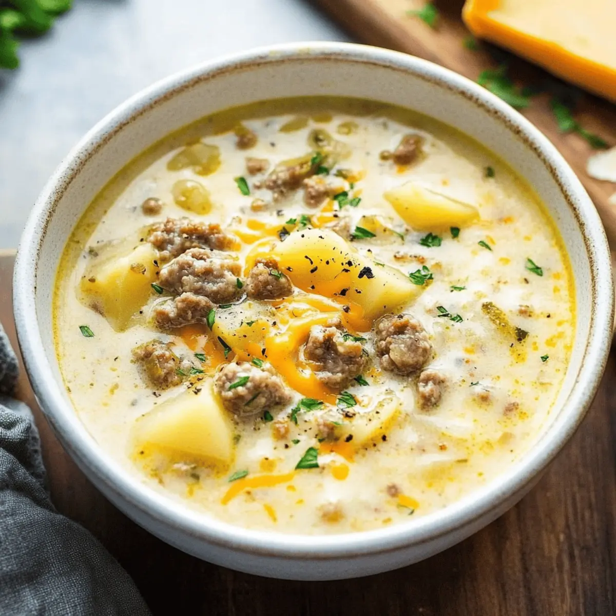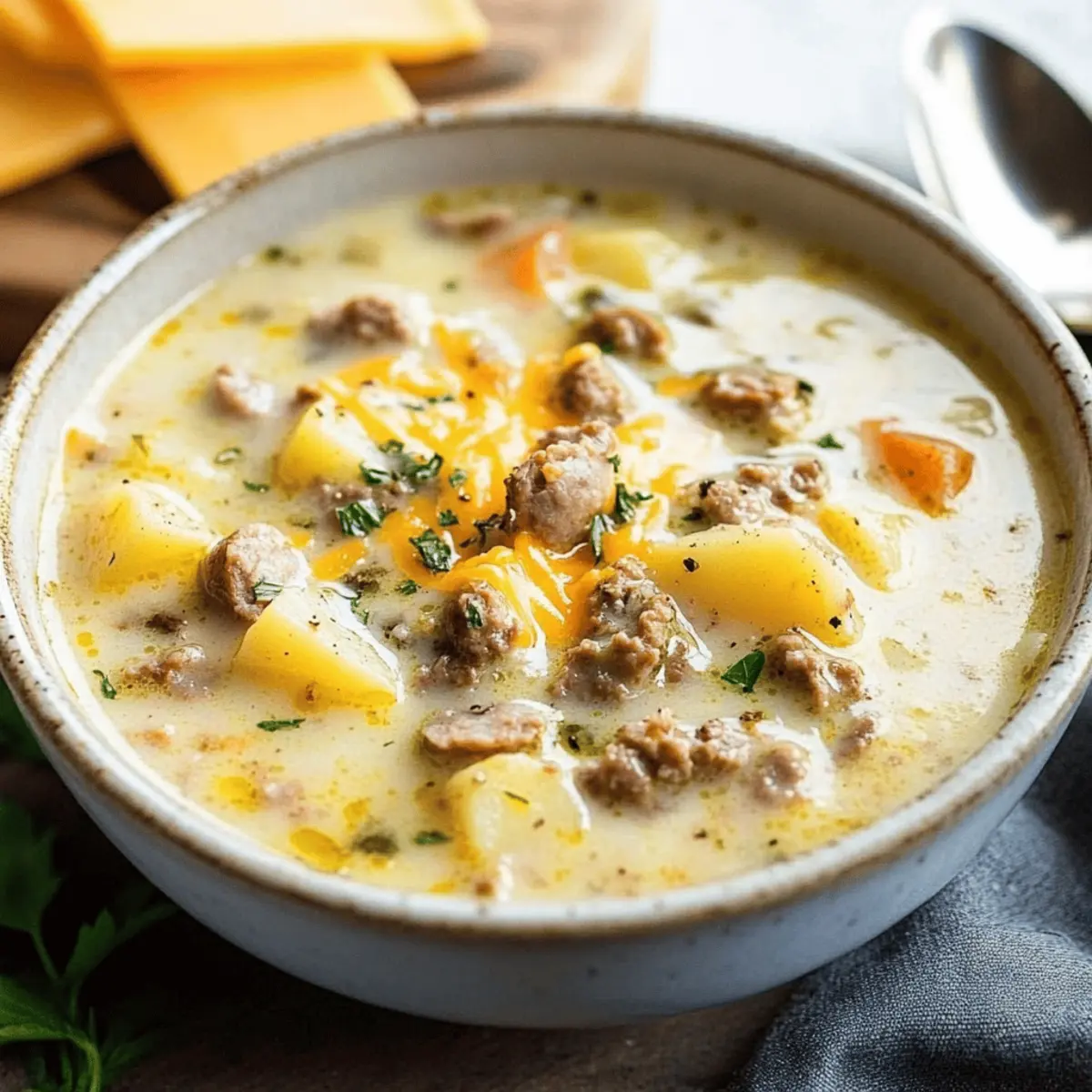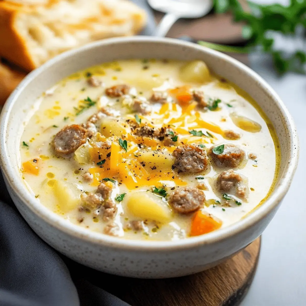 As the chill of fall sets in, I often find myself craving something warm and comforting—it’s time for some Creamy Sausage Potato Soup! This delightful dish marries savory Italian sausage with tender potatoes and a colorful array of veggies, creating a cozy embrace for chilly evenings. I’ve found that this hearty soup is a family favorite, bringing everyone together at the dinner table with its rich flavors and creamy texture. Plus, it’s incredibly easy to whip up, whether you prefer the stovetop or the convenient Crock Pot method. With just a handful of ingredients and minimal prep, weeknight meals become a breeze without sacrificing heartiness. Are you curious about how to elevate those chilly days with a bowl of this comforting delight? Let’s dive in! Why is Sausage Potato Soup a Must-Try? Comforting, this soup wraps you in warmth on the coldest days, making it an ideal choice for family gatherings. Versatile prep methods, whether on the stovetop or in a Crock Pot, fit seamlessly into your busy schedule. Deliciously creamy, the combination of sausage, potatoes, and vegetables creates a rich flavor profile that rivals any restaurant dish. Simple to prepare, even novice cooks will find success in this recipe. Plus, this soup pairs beautifully with sides like a fresh salad or crusty bread, enhancing your meal. If you’re in the mood for more cozy goodness, check out my recipes for Sausage Egg Breakfast or a heartwarming Thai Chicken Soup! Sausage Potato Soup Ingredients • Elevate your soup game with these essential ingredients! For the Soup Base Ground Italian Sausage (1 lb) – Provides the signature flavor and protein; turkey sausage can be used for a lighter twist. Butter (2 tbsp) – Adds a velvety richness; olive oil is a great alternative for a lighter option. Yellow Onion (1, diced) – Enhances the soup with sweetness; shallots work well as a substitute. Carrots (½ cup, diced) – Offers natural sweetness and texture; baby carrots can be easily swapped in. Celery (2 ribs, diced) – Adds freshness and crunch; consider leeks for a milder flavor boost. Garlic (3 cloves, minced) – Infuses layers of flavor with its savory kick; garlic powder works in a pinch. Flour (3 tbsp) – Acts as a thickening agent; cornstarch or gluten-free flour blends are good substitutes. Chicken Broth (5 cups) – The heart of the soup; vegetable broth can make a comforting vegetarian option. Heavy Cream (1 cup) – Provides that luxurious creamy texture; coconut milk makes a delightful dairy-free alternative. For the Potatoes Red Potatoes (1.25 lbs, cubed) – Ensures creaminess and retains shape; Yukon Gold or Russet potatoes can also be used for variety. Optional Creaminess & Flavor Cheddar Cheese (2 cups, optional) – Enhances the soup with creaminess; dairy-free cheese can replace it for a dairy-free version. Seasonings Dried Basil (1 tsp) – Elevates the aroma with its earthy essence. Dried Oregano (½ tsp) – Introduces depth and can be replaced with Italian seasoning. Mustard Powder (½ tsp) – Brings subtle tang; omit if unavailable. Black Pepper (¼ tsp) – Provides a mild heat; adjust to your taste preference. Soy Sauce (1 tsp) – Boosts umami; coconut aminos make a great soy-free option. Hot Sauce (1 tsp) – Adds a layer of complexity; feel free to reduce for a milder experience. With these simple ingredients, your Sausage Potato Soup is bound to become a family favorite! Step‑by‑Step Instructions for Creamy Sausage Potato Soup Step 1: Cook Sausage In a large pot over medium heat, crumble and cook 1 pound of ground Italian sausage, stirring often until browned and fully cooked, about 10–12 minutes. As the sausage sizzles, the rich aroma will fill your kitchen. Once browned, reserve about 1 tablespoon of the drippings in the pot for flavor. Step 2: Sauté Vegetables Add the reserved drippings and 2 tablespoons of butter to the pot, letting it melt. Toss in 1 diced yellow onion, ½ cup diced carrots, and 2 diced celery ribs, sautéing for about 5 minutes until the vegetables soften and the onion becomes translucent. Then, stir in 3 minced garlic cloves for an additional minute, releasing a delightful fragrance. Step 3: Make Roux Sprinkle 3 tablespoons of flour over the sautéed vegetables and cook for another 2 minutes, stirring continuously to form a roux. This step adds depth and thickness to your creamy sausage potato soup, ensuring the flavors meld beautifully. Continue to stir until the mixture is bubbly and lightly golden. Step 4: Add Liquids Gradually stir in 5 cups of chicken broth, scraping up any brown bits from the bottom of the pot for extra flavor. Once incorporated, add 1 cup of heavy cream, 1 teaspoon soy sauce, and 1 teaspoon hot sauce, along with the seasonings: 1 teaspoon dried basil, ½ teaspoon dried oregano, and others. Bring this mixture to a gentle boil, ensuring all ingredients are well blended. Step 5: Simmer Potatoes Add 1.25 pounds of cubed red potatoes to the pot and reduce the heat to a low simmer. Uncover the pot and let the soup simmer for 20-25 minutes, or until the potatoes are tender when pierced with a fork. This will create a perfect texture, allowing the flavors to deepen while the soup thickens. Step 6: Combine Ingredients Once the potatoes are tender, stir in the cooked sausage from Step 1, breaking it up as you mix it into the soup. If desired, add 2 cups of cheddar cheese at this stage, stirring until melted and creamy. Allow everything to heat through for a couple of minutes before serving this hearty sausage potato soup hot and fresh. Make Ahead Options These Creamy Sausage Potato Soup preparations are perfect for those busy weeknights! You can chop the vegetables and store them in an airtight container in the refrigerator up to 3 days prior to cooking. Additionally, you can brown the Italian sausage and sauté the veggies, then refrigerate this mixture for up to 24 hours. When you’re ready to serve, just follow the remainin