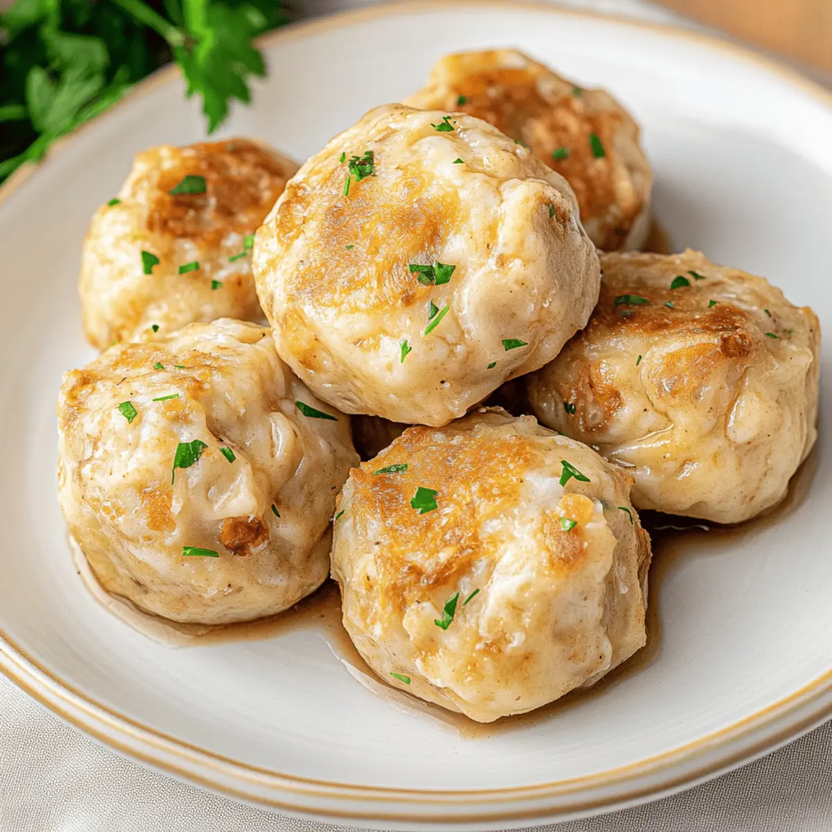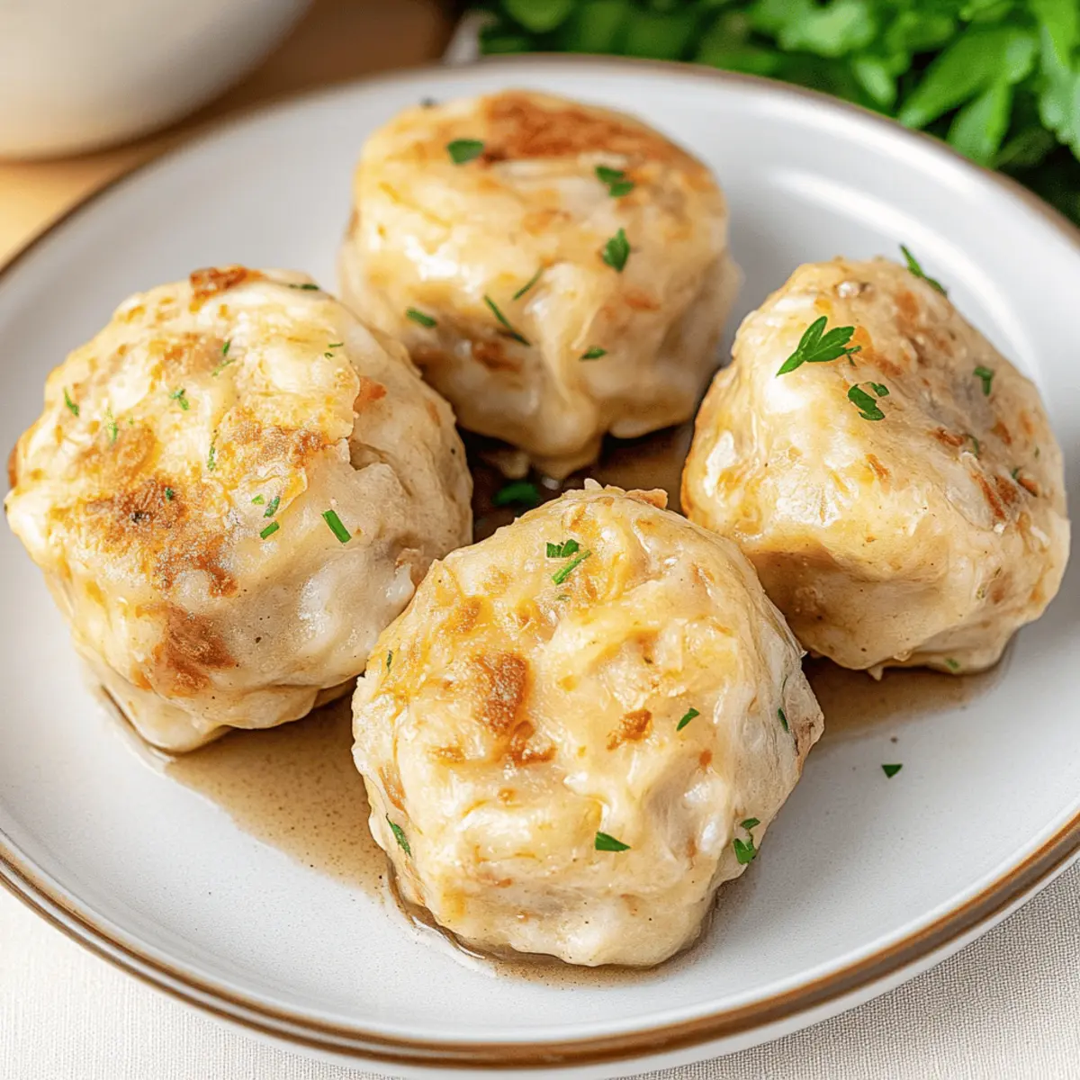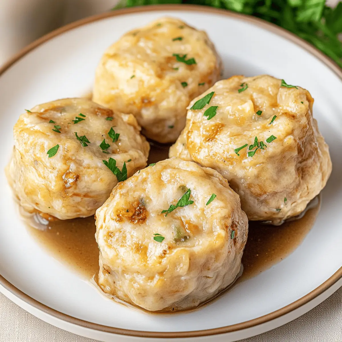As I stood in my kitchen, the scent of warm onions sautéing in butter wafted through the air, instantly transporting me to the heart of Germany. That’s when I knew today was perfect for making Semmelknödel—soft, fluffy bread dumplings that are the ultimate comfort food. This delightful dish not only turns leftover bread into something extraordinary but also brings a sense of warmth to any meal. With minimal prep and a few simple ingredients, you can create a satisfying side that pairs beautifully with rich gravies or hearty stews. Whether you’re looking to impress a crowd or simply want to elevate your weeknight dinner, these dumplings are sure to be a hit. Ready to discover the magic of Semmelknödel? Let’s dive into this nourishing recipe! Why are Semmelknödel so irresistible? Comforting, hearty dish: These Semmelknödel are the epitome of German comfort food, bringing warmth and satisfaction to your table. Simple ingredients: A few basic staples transform leftover bread into something magical, showcasing resourcefulness in the kitchen. Versatile pairing: Serve them with savory gravies, rich goulash, or hearty vegetable stews; they complement countless meals with ease. Quick prep time: With minimal effort required, you’ll have fluffy dumplings ready to impress in no time! Unique flavor profile: The combination of sautéed onions, fresh parsley, and a hint of nutmeg creates a beautifully balanced taste. These fluffy dumplings are not just a dish; they’re a delightful experience perfect for any occasion! Semmelknödel Ingredients • Gather the essentials for making delicious Semmelknödel, the perfect way to use up leftover bread! For the Dumplings Bread Rolls (6 rolls / 14 oz / 400g) – Use at least 1-day-old rolls or pretzels for the best texture. Milk (1 cup / 240ml) – Warm, not boiling, for optimal bread absorption during soaking. Butter (2 tablespoons) – Essential for sautéing onions, adding richness to the flavor. Onion (1 large) – Sauté until golden to bring out its natural sweetness. Chopped Parsley (3 tablespoons) – Adds a fresh, vibrant note to the dumplings. Eggs (3 large, beaten) – Acts as a binder to help hold the dumplings together. Crumbling Cooked Bacon (1/4 cup, optional) – Introduces a savory depth; omit for a vegetarian version. Nutmeg (1/4 teaspoon) – A dash brings warmth and complexity to the flavor. Salt (1 tablespoon or to taste) – Essential for enhancing the overall taste of the dumplings. Black Pepper (1/4 teaspoon) – Adds a mild kick to balance the flavors. Fine Breadcrumbs (2-4 tablespoons) – Adjust the consistency for easy dumpling shaping. Step‑by‑Step Instructions for Semmelknödel Step 1: Prepare the Bread Begin by cutting your leftover bread rolls into 1/2 to 3/4 inch pieces, placing them in a large bowl or pot. This will create the base for your Semmelknödel. The bread should be slightly stale for the best texture. Set aside while you prepare the soaking liquid. Step 2: Soak the Bread Heat 1 cup of milk in a small saucepan until it is warm but not boiling. Pour the warm milk over the cut bread, ensuring every piece is soaked. Gently press the bread down and let it sit for about 10–15 minutes until it absorbs the milk and becomes soft, creating a fluffy texture. Step 3: Sauté the Onion While the bread is soaking, dice the large onion. In a skillet, melt 2 tablespoons of butter over medium heat and add the diced onion. Sauté for about 8–10 minutes, stirring frequently, until the onions turn soft and golden brown. This step enhances the sweetness and flavor of your Semmelknödel. Step 4: Combine Ingredients In a large mixing bowl, combine the soaked bread mixture with the sautéed onions, 3 tablespoons of chopped parsley, 3 beaten eggs, crumbled bacon if using, nutmeg, salt, and pepper. Mix everything together until well incorporated, then gradually knead in 2-4 tablespoons of breadcrumbs until the mixture is slightly sticky and holds together. Step 5: Shape the Dumplings With your hands lightly floured, portion the mixture into 12 round balls, each about the size of a tennis ball. Place the formed Semmelknödel on a wooden board or clean countertop. Be sure they are well-shaped to hold together during cooking. Step 6: Cook the Dumplings In a large pot, bring salted water to a gentle boil. Once boiling, reduce the heat to a simmer and carefully add the dumplings, testing one first to ensure they hold together. Let them simmer for about 20 minutes, cooking gently to achieve that light and fluffy texture. Step 7: Optional Crisping Step For an extra layer of flavor, you can take the cooked dumplings and slice them before tossing them in a skillet with a bit of butter. Pan-fry the slices until they are crispy and golden brown, adding a delightful crunch to your delectable Semmelknödel before serving. Expert Tips for Semmelknödel Choose the Right Bread: Use at least 1-day-old rolls or pretzels. Fresh bread can become too soggy, affecting the dumpling’s texture. Perfect Onion Sauté: Cook onions until golden brown, as this enhances their sweetness and adds depth of flavor to the Semmelknödel. Gentle Simmer: Ensure the water simmers gently when cooking the dumplings. A rolling boil can cause them to fall apart, so be cautious! Test Before Cooking: Always test-cook a single dumpling first. This allows you to adjust the mixture if it’s too loose or dry. Play with Variations: Feel free to get creative! Experiment with different herbs or add bacon for extra flavor; just remember not to overdo it. Make-Ahead Magic: These dumplings can be cooked in advance and stored. Simply pan-fry them before serving to add a delicious crispiness to the outside. Variations & Substitutions for Semmelknödel Feel free to get creative and customize your Semmelknödel to suit your taste and dietary needs! Herb Swap: Substitute parsley with chives or dill for a fresh twist that adds unique flavor. Vegetarian Option: Omit the bacon ent