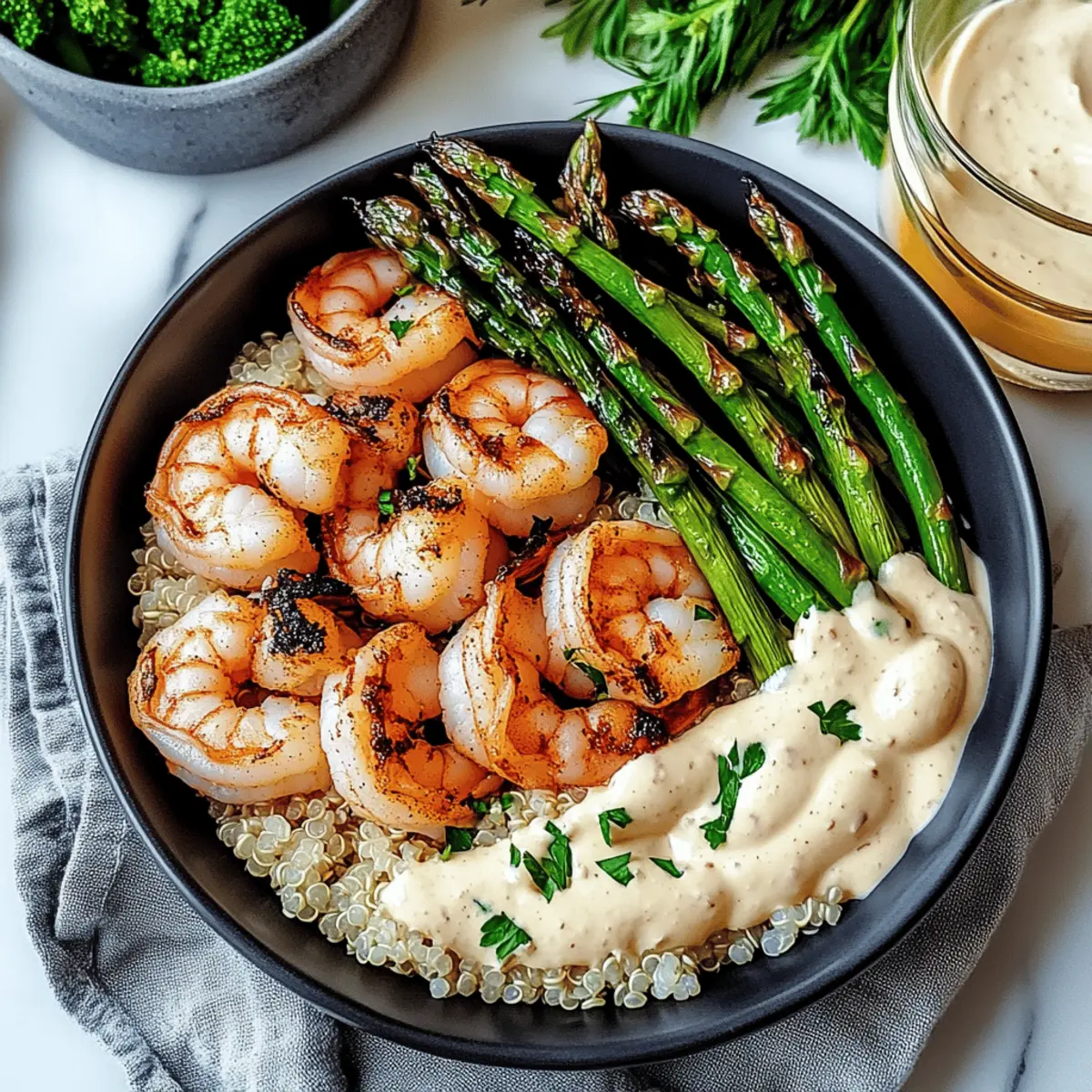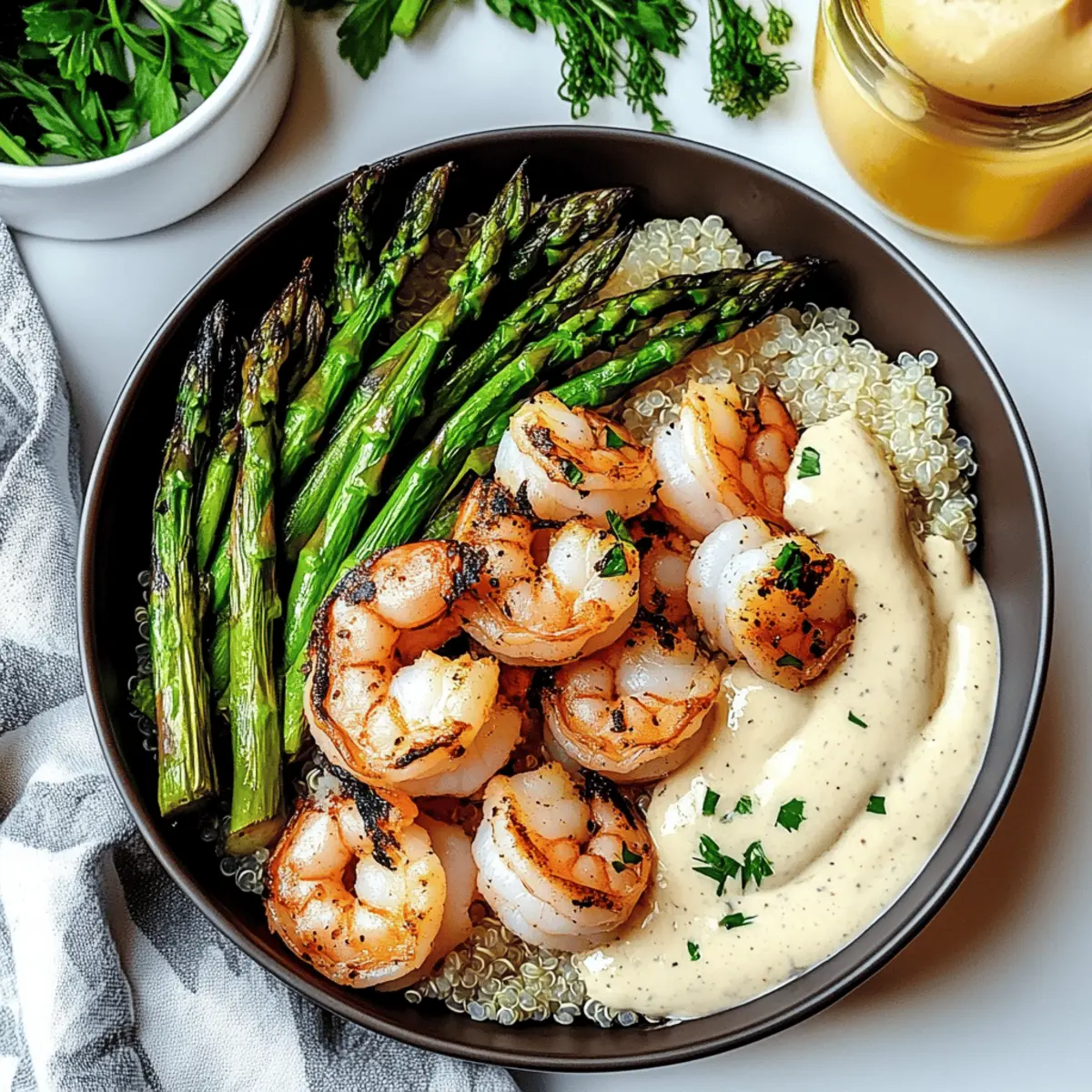 Start building your shrimp bowl by placing a generous scoop of fluffy quinoa or rice at the base. Neatly arrange the grilled shrimp and asparagus on top, ensuring each component is visible and inviting. Drizzle the creamy garlic sauce generously over the bowl for that luscious finish.