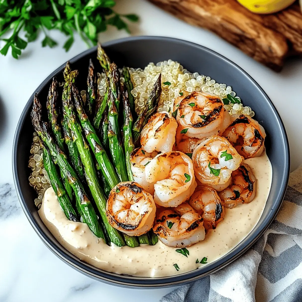 7. Assemble the bowl with quinoa or rice at the base, topped with shrimp, asparagus, and sauce.