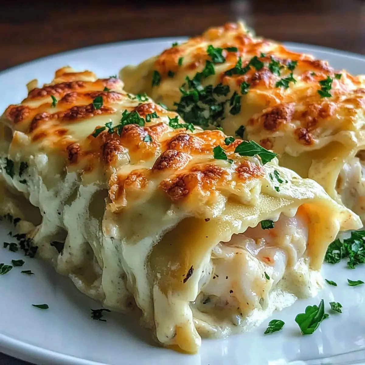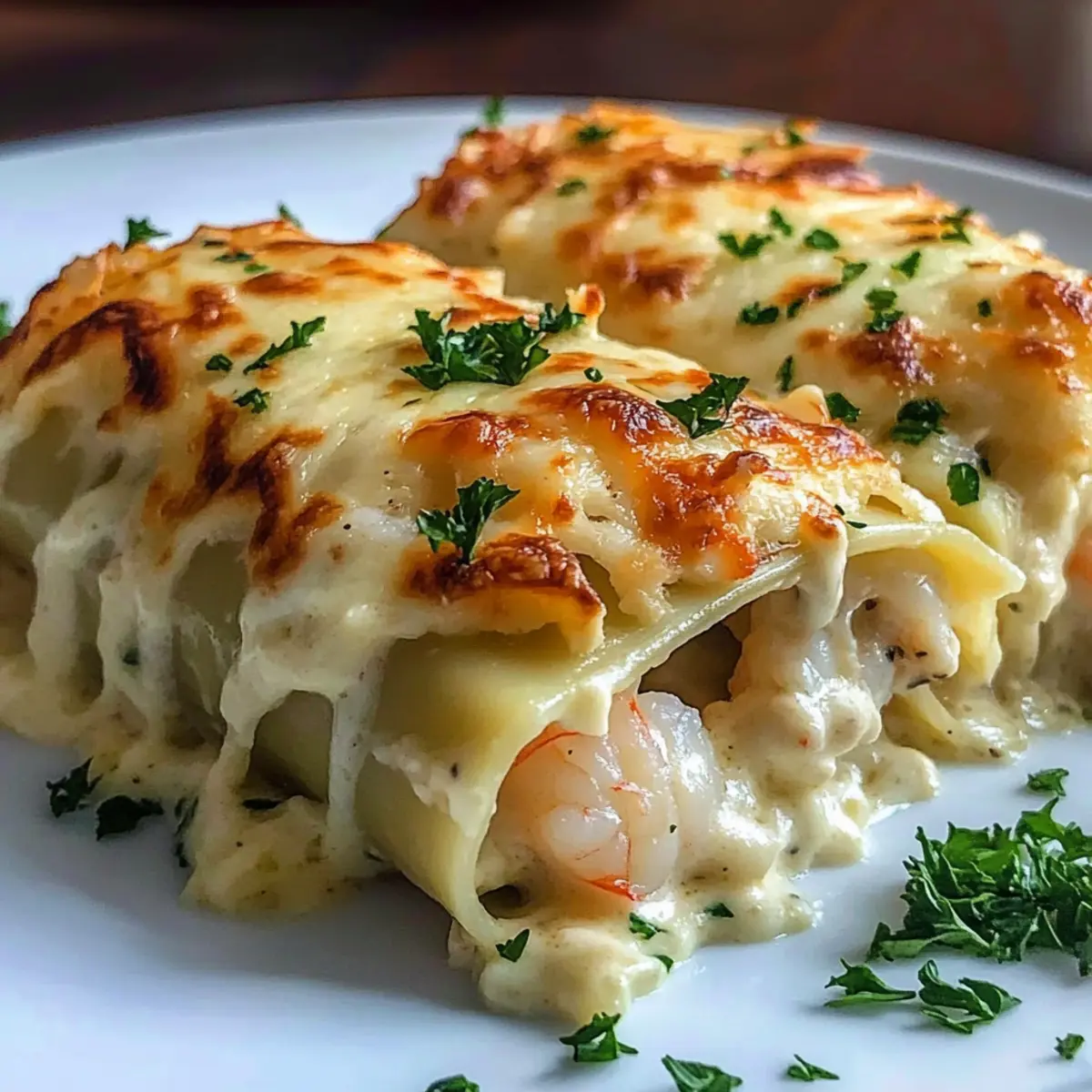 The savory aroma of bubbling cheese and cream wafts through my kitchen, instantly transporting me to a seaside bistro where seafood reigns supreme. Today, I’m thrilled to share my Shrimp Crab Alfredo Roll Ups, a delightful twist on classic lasagna that’s both elegant and comforting. This dish captures the essence of coastal cuisine, wrapping tender lasagna noodles around a rich seafood filling that’s perfect for impressing guests or whipping up for a cozy weeknight dinner. Not only is this recipe quick to prepare, but it’s also a fantastic way to savor the flavors of the ocean without a lengthy cooking process. Best of all, these roll ups can be made ahead, making them an ideal choice for busy home chefs. Are you ready to dive into this creamy, seafood-infused adventure? Let’s get cooking! Why Are You Going to Love This? Indulgent flavors: The rich combination of shrimp and crab enveloped in creamy Alfredo sauce creates an unparalleled taste experience. Quick prep time: This dish is easy to put together, making it perfect for those busy weeknights. Customizable: Feel free to substitute ingredients—try using extra shrimp or even a mix of seafood for a personal touch! You’ll also love how well these Shrimp Crab Alfredo Roll Ups pair with a crisp Caesar salad or buttery garlic bread. Crowd-pleaser: Whether for a cozy family dinner or a festive gathering, these roll-ups will wow your guests and leave them asking for seconds! Make-ahead convenience: You can prepare the roll-ups ahead of time, refrigerating or freezing them, making your life much easier when it comes time to serve. Shrimp Crab Alfredo Roll Ups Ingredients Get ready to gather everything you need for these delightful roll ups! For the Roll Ups Lasagna Noodles – Provide the perfect structure; cook until just al dente to prevent tearing. Cooked Shrimp – Adds a sweet, tender bite; feel free to swap in extra lump crab meat for a richer flavor. Crab Meat – Introduces a delicate seafood essence; high-quality imitation crab is a great milder substitute. Ricotta Cheese – Contributes creamy lightness; low-fat versions work beautifully for a lighter dish. Shredded Mozzarella Cheese – Melts deliciously, ensuring a gooey, flavorful finish. Grated Parmesan Cheese – Enhances umami flavors and browns beautifully on top during baking. Garlic Powder – Infuses aromatic depth; fresh garlic can be an excellent, bolder alternative. Italian Seasoning – Blends herbs for authentic Italian taste; swap with fresh basil or oregano for a vibrant twist. Salt and Pepper – Key for seasoning; adjust according to your personal taste. For the Sauce Alfredo Sauce – Provides creaminess and flavor richness; you can use homemade or store-bought, or try a light béchamel for a healthier option. For Garnish Fresh Parsley – Adds a refreshing pop of color and flavor; chop finely for best results. Dive into this satisfying dish with these carefully selected ingredients and enjoy every savory bite! Step‑by‑Step Instructions for Shrimp Crab Alfredo Roll Ups Step 1: Preheat the Oven Begin by preheating your oven to 375°F (190°C) to ensure it’s hot and ready for baking. This temperature will help create that beautiful, bubbly cheese top you desire for your Shrimp Crab Alfredo Roll Ups. While the oven heats, gather your ingredients so you’re ready to assemble your delicious dish. Step 2: Prepare the Lasagna Noodles Cook the lasagna noodles according to the package instructions, usually about 8-10 minutes, until they are just al dente. Drain them carefully and lay them out flat on a clean surface or a baking sheet to prevent sticking. This preparation will ensure a smooth assembly process for your roll-ups. Step 3: Mix the Filling In a large mixing bowl, combine your cooked shrimp, crab meat, ricotta cheese, garlic powder, Italian seasoning, salt, and pepper. Use a spatula to mix everything together until evenly incorporated, ensuring that every bite of the Shrimp Crab Alfredo Roll Ups is packed with flavor. Set the mixture aside for easier handling. Step 4: Layer the Alfredo Sauce Spread a generous layer of Alfredo sauce evenly on the bottom of a baking dish, about 1-2 cups, to prevent sticking and add moisture. This will create a delicious creamy base that enhances the flavors of the shrimp and crab in your roll-ups. Ensure the sauce covers the entire base of the dish. Step 5: Assemble the Roll Ups Take a lasagna noodle and spread about 2-3 tablespoons of the seafood mixture on top. Roll the noodle tightly, ensuring the filling stays enclosed, and place seam-side down in the prepared baking dish. Repeat this process with the remaining noodles, arranging the Shrimp Crab Alfredo Roll Ups snugly in the dish. Step 6: Add Remaining Sauce and Cheese Pour the remaining Alfredo sauce over the assembled roll-ups, making sure they are well coated. Then, sprinkle a generous amount of shredded mozzarella and grated Parmesan cheese on top, creating a luscious cheese layer that will melt and brown beautifully during baking, enhancing the overall flavor. Step 7: Bake Covered Cover the baking dish tightly with foil and bake in the preheated oven for 25 minutes. This step allows the flavors to meld together while keeping the roll-ups moist. You’ll know it’s time to uncover them when the aroma fills your kitchen and the cheeses start to melt. Step 8: Bake Uncovered for Finishing Touch After 25 minutes, carefully remove the foil and return the dish to the oven. Bake for an additional 10 minutes, or until the cheese is bubbly and golden brown. Keep an eye on the roll-ups to achieve that irresistible crust that signals they’re ready to be served. Step 9: Garnish and Serve Once baked, take the dish out of the oven and let it cool for a few minutes. Before serving, sprinkle freshly chopped parsley over the top for a pop of color and freshness. Your Shrimp Crab Alfredo Roll Ups are now ready to impress guests or delight your family at the dinner t