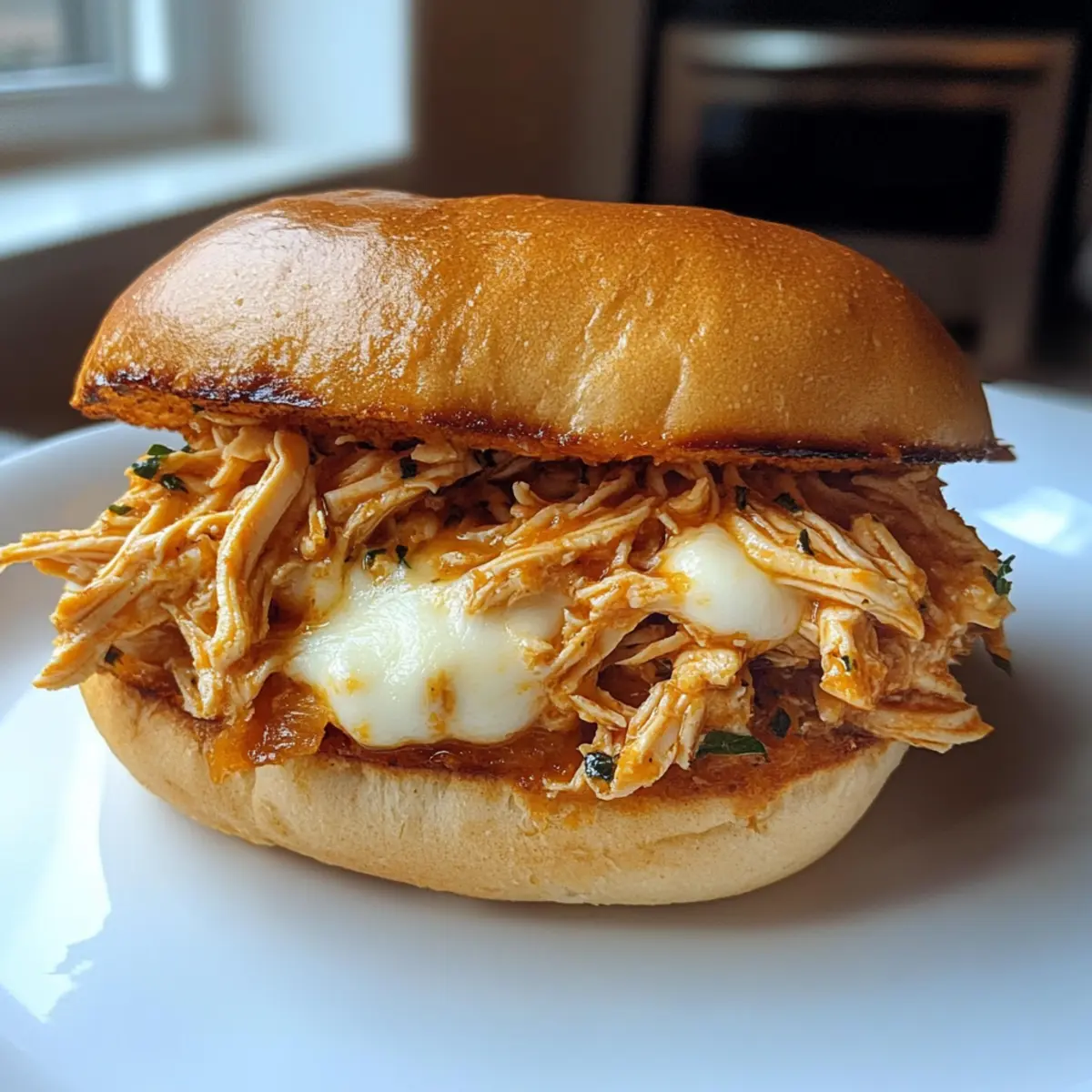 Now it’s time to build your sandwiches! Generously pile the shredded chicken into the toasted rolls, topping them with a layer of mozzarella cheese. If you like, pop the assembled sandwiches under the broiler for 1-2 minutes until the cheese is melty and bubbly, adding that extra touch of deliciousness.