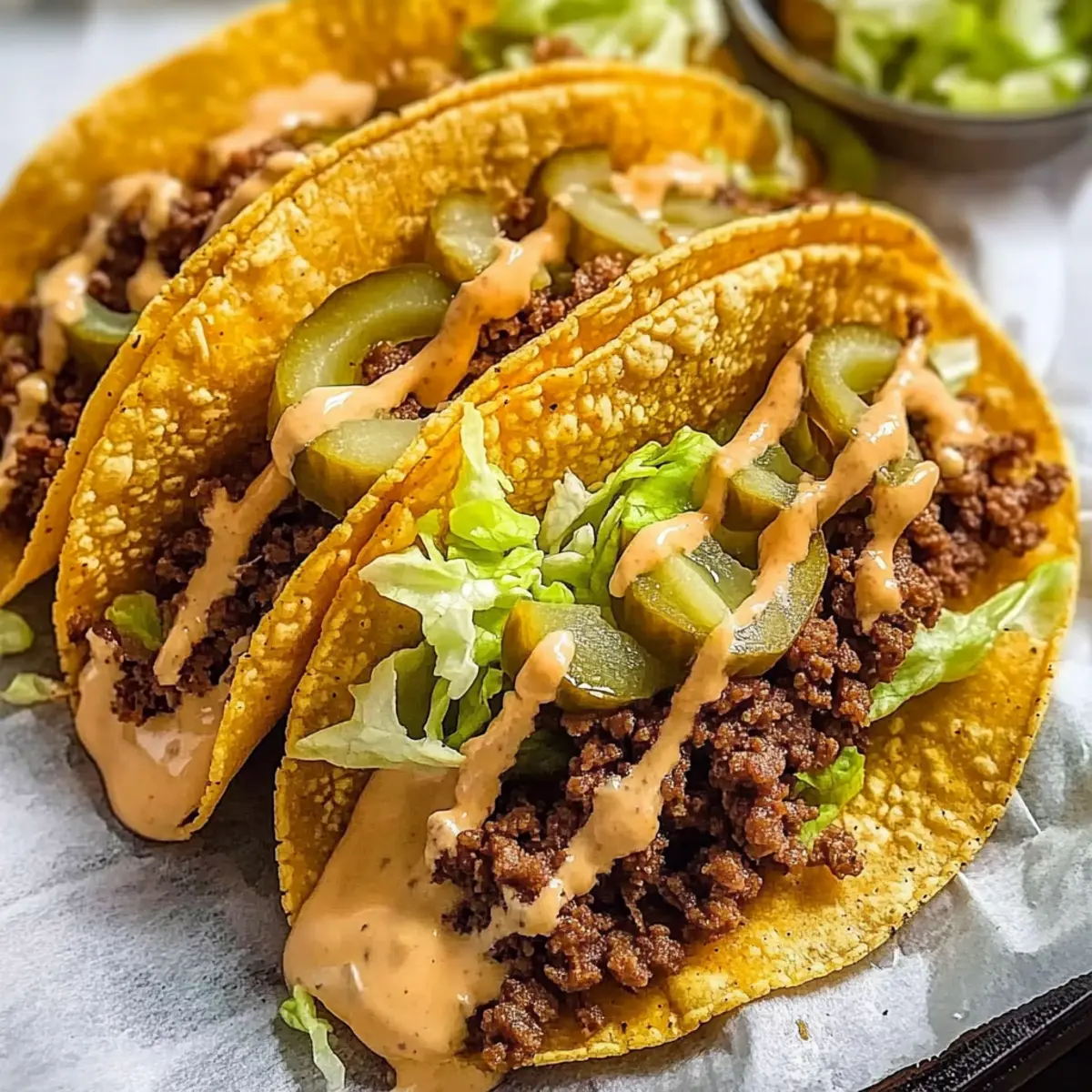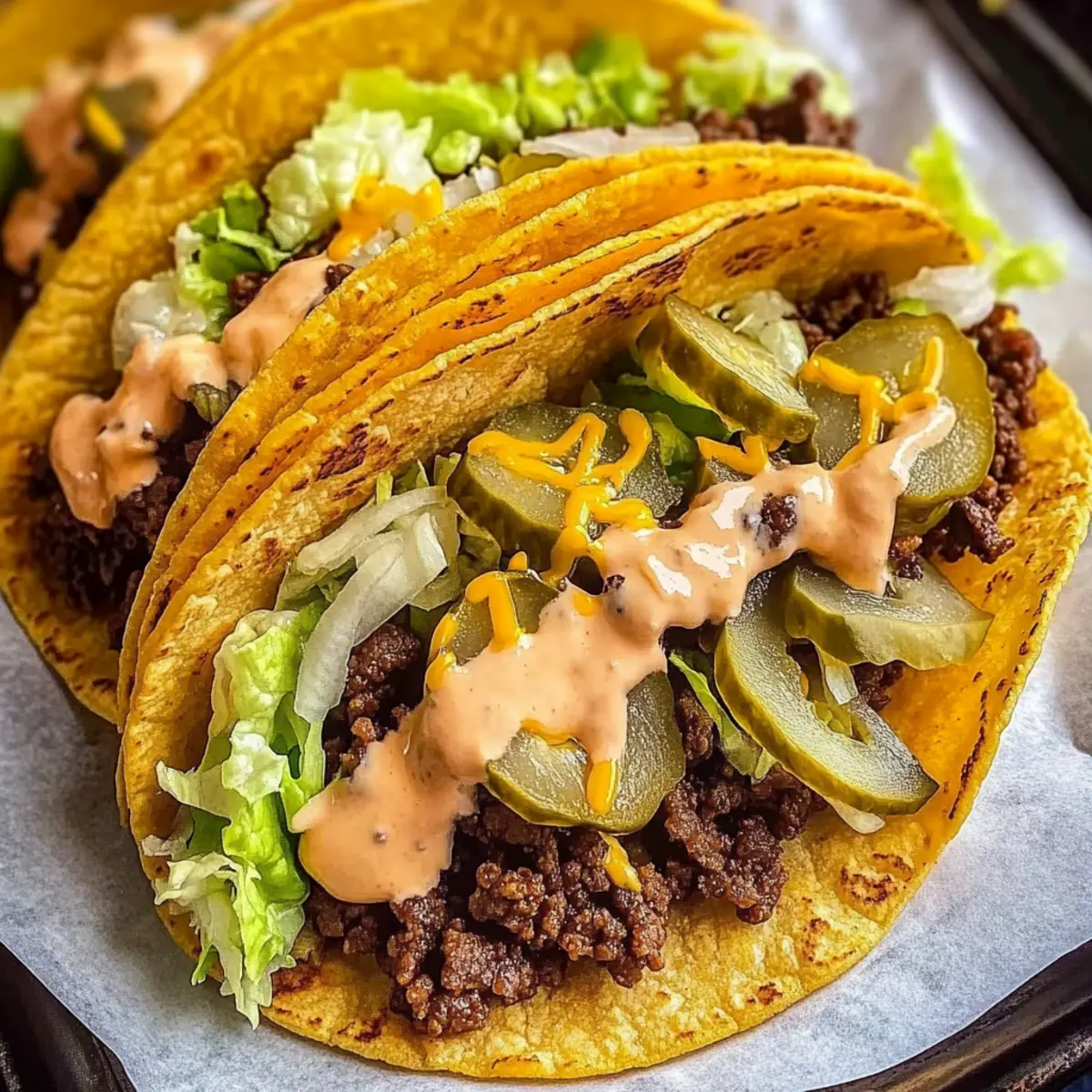 As I flipped through my recipe book one evening, I stumbled upon an idea that made me stop in my tracks: Smash Burger Tacos. It’s a delightful combination that fuses two beloved meals into one, and trust me, it has become a staple in my kitchen. In just 20 minutes, these tacos transform ground beef into seasoned perfection, all wrapped up in crispy tortillas and topped with melted cheese and a creamy sauce. The best part? They’re completely customizable, making them a hit with the entire family—kids included! Whether it’s a busy weeknight dinner or a weekend gathering with friends, these Smash Burger Tacos are sure to be a crowd-pleaser. Are you ready to take your taco game to the next level? Why are Smash Burger Tacos a must-try? Quick Preparation: In just 20 minutes, you can serve up these delicious tacos, making them perfect for busy weeknights! Customizable Fun: Tailor each taco to your taste; with different cheeses, toppings, and sauces, every bite can be a little different. Kid-Friendly Appeal: Kids love the handheld nature and familiar flavors of burgers and tacos combined, ensuring even the pickiest eaters will enjoy. Crispy and Juicy: The satisfying contrast of the crispy tortilla with the juicy, seasoned beef inside creates a delightful eating experience. For a twist on traditional flavors, try pairing them with some Baked Chicken Tacos or some hearty Butter Beef Cheeseburger options. Enjoy the fusion magic! Smash Burger Tacos Ingredients For the Beef Filling • Ground Beef – The main filling providing rich flavor; consider ground turkey or plant-based meat for a lighter option. • Salt and Pepper – Essential seasonings to elevate the beef’s taste; adjust according to your preference. For the Tortillas • Tortillas – The foundation of your tacos; choose between corn for a robust flavor or flour for a softer texture. For the Cheese • Cheese – A melting delight adding creaminess; American cheese is classic, but cheddar or pepper jack can add a flavorful twist. For the Sauce • Burger Sauce – A creamy component that brings everything together; easily made with mayonnaise, ketchup, and spices of choice. For the Toppings • Lettuce – Adds freshness and a crunch; consider swapping with spinach for a nutrient boost. • Onions – Provide flavor and a bit of bite; use raw or caramelized for a sweeter option. • Pickles – Give a tangy crunch that complements the tacos; feel free to try jalapeños or avocado for a spicy or creamy twist. Elevate your taco night with these Smash Burger Tacos that bring the best of both worlds to your plate! Step‑by‑Step Instructions for Smash Burger Tacos Step 1: Prepare Ingredients Start by gathering your ingredients to create your Smash Burger Tacos. Portion the ground beef into four equal amounts, ensuring they are shaped into round patties. Prepare your tortillas by laying them out, and get your cheese, burger sauce, and desired toppings ready. Having everything organized will streamline your cooking process and make assembly a breeze. Step 2: Season Beef Take each beef patty and season generously with salt and pepper on both sides for enhanced flavor. Then, place one seasoned patty onto a tortilla, pressing it down slightly to ensure it adheres. This step is crucial as it allows the flavors to penetrate the meat while holding it together during cooking, ensuring each taco is bursting with savory goodness. Step 3: Cook Heat a skillet over medium-high heat and add a drizzle of oil to prevent sticking. When the oil is shimmering, gently lay the tortilla with the beef patty in the skillet, meat side down. Use a spatula to apply light pressure, cooking it for 2-3 minutes until a golden-brown crust forms on the beef, adding flavor and texture to your Smash Burger Tacos. Step 4: Add Cheese Once the meat is cooked and has developed a nice crust, carefully flip the tortilla to the other side. Place a slice of cheese on top of the cooked patty and continue cooking for an additional 1-3 minutes. Keep an eye on the cheese as it melts and bubbles, transforming your taco into a gooey, delicious delight that is unmistakably irresistible. Step 5: Assemble Tacos Remove the taco from the skillet, and repeat the cooking process for each remaining tortilla and patty. After cooking, spread a generous amount of burger sauce over the melted cheese, and layer in fresh toppings such as lettuce, onions, and pickles. This customization allows each Smash Burger Taco to showcase your personal flair and taste preferences. Step 6: Serve Your Smash Burger Tacos are now ready to enjoy! Serve them hot right off the skillet for the best experience, and consider pairing them with sides like fries or a fresh salad. These flavorful tacos are sure to impress at family dinners or casual gatherings, making any meal feel special with their delightful fusion of tastes. Smash Burger Tacos: Flavorful Upgrades Await Feel free to get creative with these delicious tacos and explore exciting twists that elevate every bite! Ground Turkey: Swap ground beef for turkey for a healthier alternative without sacrificing flavor. A fantastic choice for lighter fare! Plant-Based Meat: Use a plant-based meat substitute to cater to vegetarians or vegan diets. It’s just as satisfying and flavorful! Cheese Variety: Try different cheeses like sharp cheddar or spicy pepper jack for an exciting flavor boost. Each melt will transform your taco experience! Add Heat: Sprinkle on some diced jalapeños or a drizzle of your favorite hot sauce for a spicy kick that elevates the classic flavors. Your taste buds won’t know what hit them! Creamy Additions: Mix some avocado or guacamole into your toppings for a creamy twist that pairs beautifully with the savory flavors. This addition is bound to be a favorite! Herb Enhancements: Sprinkle fresh cilantro or parsley on top to add a refreshing burst of flavor that complements the rich beef. A sprinkle of freshness makes all the difference! 