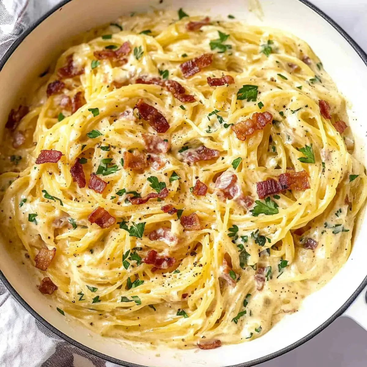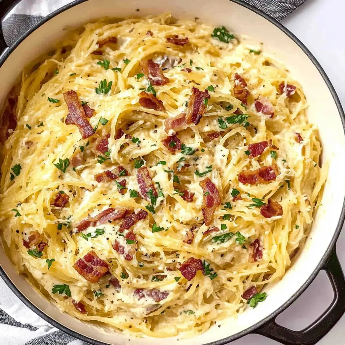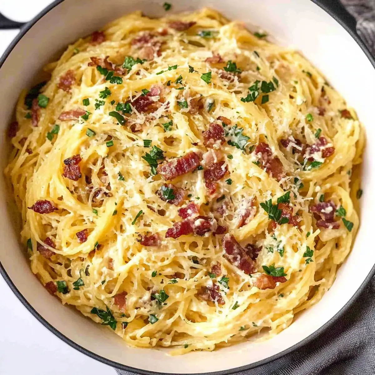 As I was rummaging through my recipe box, a familiar spark of inspiration struck me like a lightning bolt: low-carb Spaghetti Squash Carbonara! This dish takes the traditional comfort of carbonara and gives it a healthy twist, creating a delightful masterpiece that feels indulgent yet guilt-free. The spaghetti squash serves as a perfect pasta substitute, transforming the way we think about carbs without sacrificing any creamy satisfaction. With every bite, you’ll experience the smoky richness of crispy bacon mingling with the luscious sauce—truly a win-win for anyone looking to lighten up their meals. And if you’re vegetarian, no worries! I’ve got a delicious option for you too. So, are you ready to embark on this culinary adventure and make weeknight dinners something to rave about? Why is Spaghetti Squash Carbonara a Must-Try? Guilt-Free Indulgence: This dish redefines comfort food by using spaghetti squash as a low-carb swap, allowing you to enjoy traditional carbonara flavors without the heaviness. Crispy and Creamy: The delightful contrast of crispy bacon and smooth, creamy sauce takes your taste buds on a journey of texture and flavor. Quick and Easy: With minimal prep and cooking time, you can whip this up during a busy weeknight while impressing your guests. Versatile Options: Whether you want to keep it classic or turn it vegetarian, the recipe easily adapts to any preference. Crowd-Pleaser: Perfect for family dinners, this dish will leave everyone raving—definitely a win if you’re tired of the usual fast food rut. Pair it with a fresh salad or some garlic bread for a complete meal. Dive into the delicious world of flavors with this Spicy Chicken Spaghetti for another twist on pasta! Spaghetti Squash Carbonara Ingredients For the Squash • Spaghetti Squash – The star of the dish; bake and shred to create your low-carb noodle base. For the Sauce • Egg Yolks/Eggs – These add a rich creaminess; be sure to use room temperature eggs for the best texture. • Parmesan Cheese – This sharp cheese adds depth to the sauce; finely grated ensures smooth mixing. • Bacon (or Pancetta/Guanciale) – Provides that savory, smoky flavor that makes this dish unforgettable; opt for a vegetarian substitute if desired. • Garlic – Enhances the overall flavor; minced is ideal for quick sautéing. • Kosher Salt – A key ingredient for flavor enhancement; adjust to suit your taste. For Garnish • Parsley – Adds a burst of freshness and color; don’t skip this step for a lovely finishing touch! Enjoy this delightful Spaghetti Squash Carbonara as it comforts your soul while keeping your carb count low! Step‑by‑Step Instructions for Spaghetti Squash Carbonara Step 1: Prepare the Squash Preheat your oven to 400°F (200°C) while you prepare the spaghetti squash. Carefully slice it in half lengthwise and scoop out the seeds. Place the squash cut side down on a baking sheet lined with parchment paper. Bake in the preheated oven for 30-45 minutes, or until it feels tender when pierced with a fork. Step 2: Make the Sauce While the squash is baking, whisk together in a mixing bowl the room temperature eggs, egg yolks, and finely grated Parmesan cheese until fully combined. This mixture should be smooth and creamy, ensuring it will coat the spaghetti squash perfectly. Set the bowl aside, allowing the flavors to meld. Step 3: Cook the Bacon In a large skillet over medium heat, add chopped bacon or your choice of pancetta/guanciale. Sauté for about 5-7 minutes, stirring occasionally, until the bacon is sizzling and crispy. Once the bacon reaches a deep golden color, add the minced garlic to the skillet, cooking for an additional 1-2 minutes until fragrant but not browned. Step 4: Combine Ingredients Once the spaghetti squash is done baking, carefully remove it from the oven and let it cool for a few minutes. Use a fork to shred the squash strands into noodle-like pieces. Add the cooked spaghetti squash to the skillet with the crispy bacon and garlic, season lightly with kosher salt, and toss everything together to ensure the flavors meld. Step 5: Incorporate Eggs Remove the skillet from the heat, allowing it to cool for a moment before adding the egg and cheese mixture. Using tongs, slowly stir in the egg mixture while tossing the squash and bacon, ensuring the sauce coats the strands without cooking the eggs. The residual heat will create a creamy sauce as you mix. Step 6: Serve and Garnish Once the spaghetti squash carbonara is well combined and creamy, serve it immediately. Garnish generously with extra Parmesan cheese and freshly chopped parsley for a pop of color and flavor. Enjoy the delicious transformation of traditional carbonara into this guilt-free delight! Expert Tips for Spaghetti Squash Carbonara Room Temperature Eggs: Ensure your eggs are at room temperature before whisking; this helps achieve a smoother, creamier sauce without lumps. Mind the Heat: Always remove the skillet from heat before adding the egg mixture; this prevents the eggs from scrambling and maintains a silky texture. Leftover Love: If you have leftovers, reheat gently on low heat while adding a splash of cream or broth to keep the sauce creamy and luscious. Perfect Pasta Alternative: Toss the spaghetti squash strands well to ensure they’re evenly coated with the sauce—it’s all about that creamy goodness with every bite! Creative Swaps: Don’t hesitate to experiment! Swap bacon for veggie options or add sautéed spinach for a nutritious boost to your Spaghetti Squash Carbonara. How to Store and Freeze Spaghetti Squash Carbonara Fridge: Store any leftovers in an airtight container for up to 3 days. This helps maintain the creamy texture of your Spaghetti Squash Carbonara. Freezer: Place the cooled carbonara in a freezer-safe container or bag for up to 2 months. When ready to eat, thaw overnight in the fridge before reheating. Reheating: Heat on the stove over low to medium heat, adding a spl