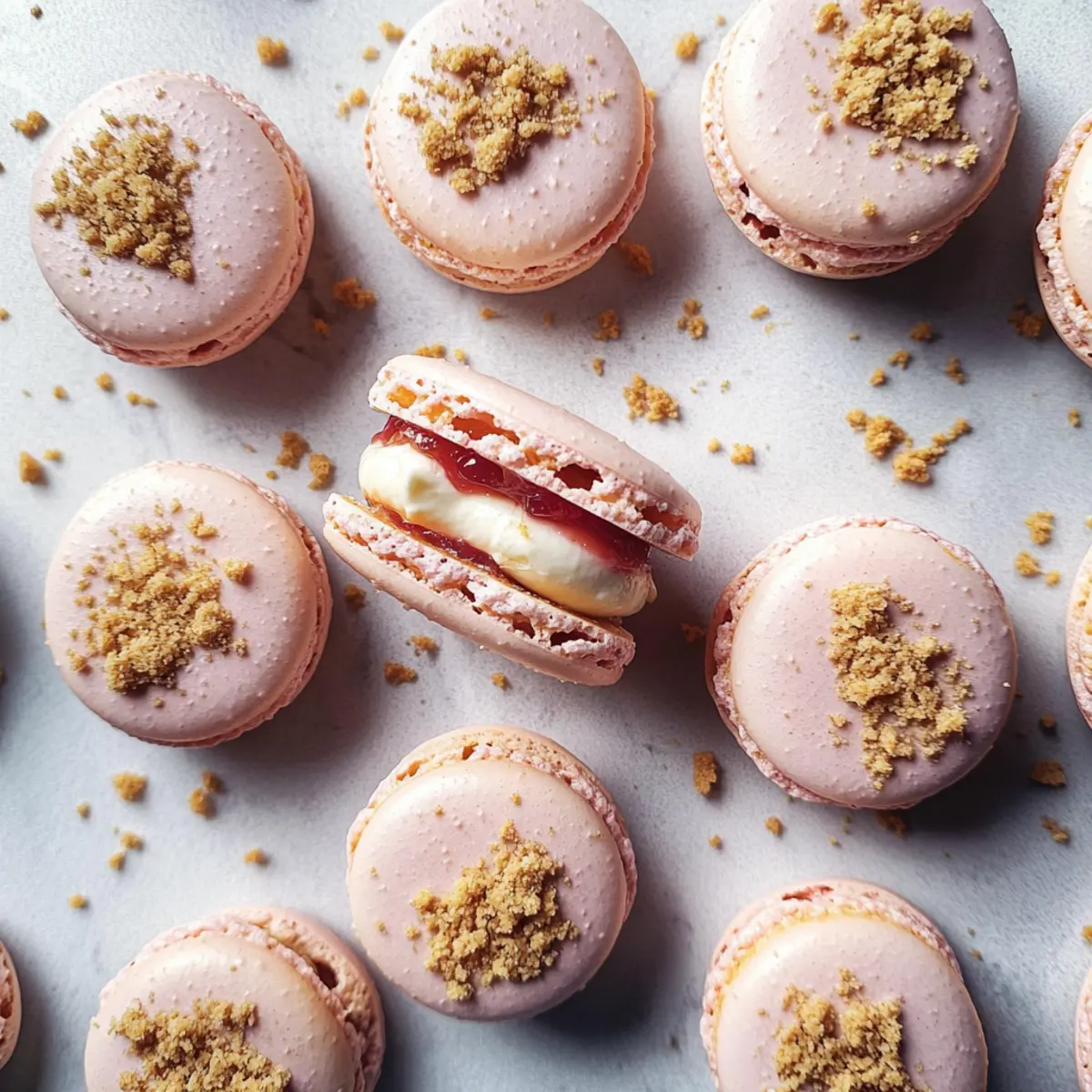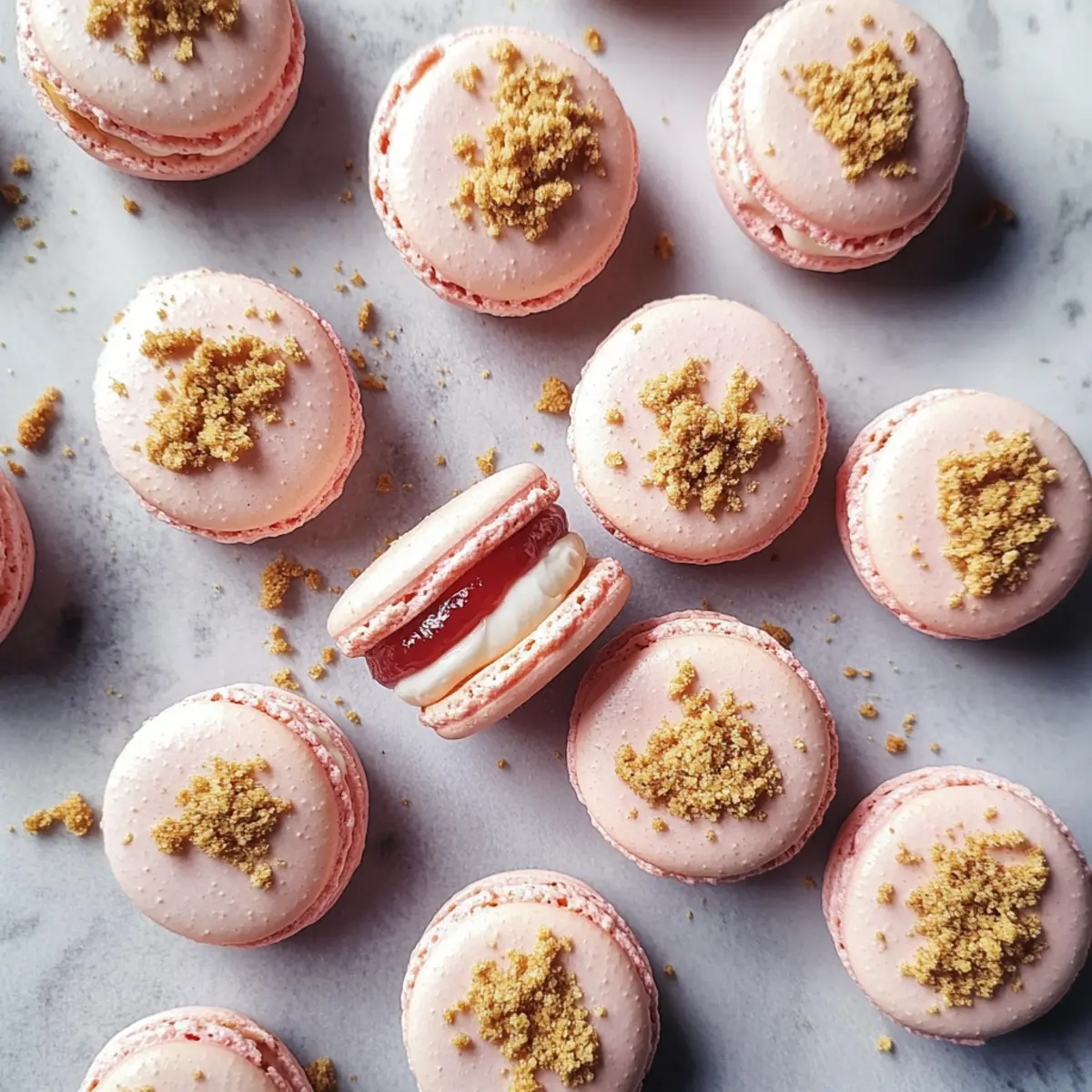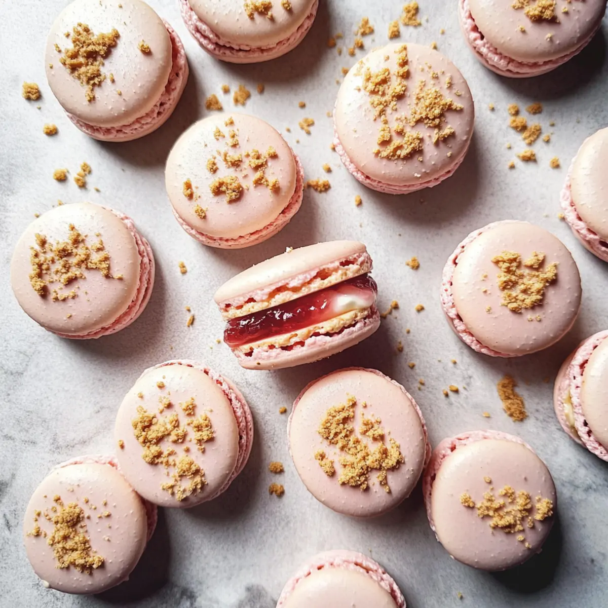 As the sweet scent of strawberries mingles with the cozy aroma of baking, I can’t help but feel a rush of joy at the thought of my latest creation: Strawberry Cheesecake Macarons. These delightful pink confections are not just visually captivating; they’re a testament to the magic of combining textures and flavors. With a creamy cream cheese frosting nestled between two perfectly chewy macaron shells and a luscious homemade strawberry jam filling, each bite is a celebration of indulgence. The best part? They’re surprisingly quick to prepare and make for an impressive crowd-pleaser at any gathering! Are you ready to elevate your dessert game and impress your friends with these charming treats? Let’s dive into the bliss of baking together! Why Are These Macarons Unique? Unforgettable Flavor: The combination of fresh strawberries and cream cheese delivers a delightful taste that will have you craving more. Chewy Perfection: The perfectly chewy macaron shells create a satisfyingly delicious texture that complements the smooth frosting. Easy to Make: You’ll be surprised at how simple the process is, making these macarons a fabulous choice for bakers of all skill levels. Impressive Presentation: With their vibrant pink hue and elegant white chocolate drizzle, these macarons are sure to steal the spotlight at any event. Customizable Joy: Explore flavors by swapping strawberries for other fruits, like raspberries or blueberries, for a personal twist—perfect for those who love to innovate in the kitchen. Dive into the sweet experience of baking these delightful Strawberry Cheesecake Macarons, and don’t forget to check out my recipe for Vanilla Bean Cheesecake if you’re in the mood for another cheesecake treat! Strawberry Cheesecake Macaron Ingredients Unlock the secrets to making these delightful strawberry cheesecake macarons! For the Macaron Shells • Super-fine Almond Flour – Provides structure and a delicate texture; ensure it’s finely ground for the best results. • Powdered Sugar – Adds sweetness and helps create a smooth batter; substitute with coconut sugar for a slightly darker flavor. • Egg Whites (90 g, room temperature and aged for 24 hrs) – Essential for meringue structure; aging helps achieve the right consistency. • Granulated Sugar – Sweetens the meringue; standard sugar is fine—no substitutions required. • Pink Gel Food Colouring – Adds a festive touch to macaron shells; use any color or skip if not desired. For the Strawberry Jam Filling • Frozen Strawberries (100 g) – For the jam filling; fresh strawberries can be used but add 1-2 tablespoons water to help them cook down. • Granulated Sugar for Jam (3 tablespoons) – Facilitates the jam-making process; can be replaced with honey for natural sweetness. For the Cream Cheese Filling • Cream Cheese (100 g, softened) – Provides a rich and creamy filling; vegan cream cheese can substitute for a dairy-free version. • Powdered Sugar for Filling (200 g) – Sweetens the cream cheese; no substitutions suggested. • Vanilla Extract (½ teaspoon) – Enhances flavor; use pure extract for the best taste. For the Topping • White Chocolate (50 g, melted) – Used for drizzling; enhances sweetness but can be omitted for a less sweet macaron. • Honey Graham Cracker (1 sheet, crushed) – For topping texture and flavor; can be skipped or replaced with digestive biscuit crumbs. Dive in, and let’s create some unforgettable strawberry cheesecake macarons together! Step‑by‑Step Instructions for Strawberry Cheesecake Macarons Step 1: Prepare Baking Sheets Begin by preheating your oven to 290°F (143°C). While it warms, line two baking sheets with parchment paper, ensuring they’re smooth and free of wrinkles. This will provide the perfect surface for your strawberry cheesecake macarons. Step 2: Sift Dry Ingredients In a mixing bowl, combine the super-fine almond flour and powdered sugar. Carefully sift this mixture together to eliminate any lumps—this step is crucial for creating the smooth texture of the macaron shells. Set this aside while you whip your egg whites. Step 3: Whip Egg Whites Using a stand mixer, add room temperature egg whites to the bowl and beat on medium speed until frothy. Gradually sprinkle in the granulated sugar, then increase the speed to high. Continue whipping until stiff peaks form, and fold in a few drops of pink gel food coloring, achieving a lovely pastel hue. Step 4: Combine Ingredients Gently fold half of the sifted dry ingredients into the meringue using a spatula, being careful not to deflate the mixture. Once incorporated, add the remaining dry ingredients, and continue to fold until the batter flows smoothly and forms a ribbon-like consistency, which is essential for the perfect macaron texture. Step 5: Macaronage Technique To achieve the correct consistency, perform the macaronage technique by scraping the batter against the sides of the bowl while gently folding. You want a thick, glossy batter that falls easily from your spatula in a ribbon, ideal for piping your strawberry cheesecake macarons. Step 6: Pipe Macaron Shells Transfer the macaron batter into a piping bag fitted with a round tip. Pipe even circles, roughly 1.5 inches in diameter, onto the prepared baking sheets, leaving space between each. The piping should be done in a swift, smooth motion to create perfectly shaped macaron shells. Step 7: Rest Macarons Now, let the piped macarons rest at room temperature for about 1 hour. This step is critical for forming a skin on the surface, so they won’t crack during baking. You’ll know they’re ready when they are dry to the touch and do not stick to your finger. Step 8: Bake Once rested, place the macarons in the preheated oven and bake for about 15 minutes. Keep an eye on them; they should not brown but rather be firm to the touch and easily lift off the parchment without sticking to the surface. Step 9: Make Strawberry Jam While the maca