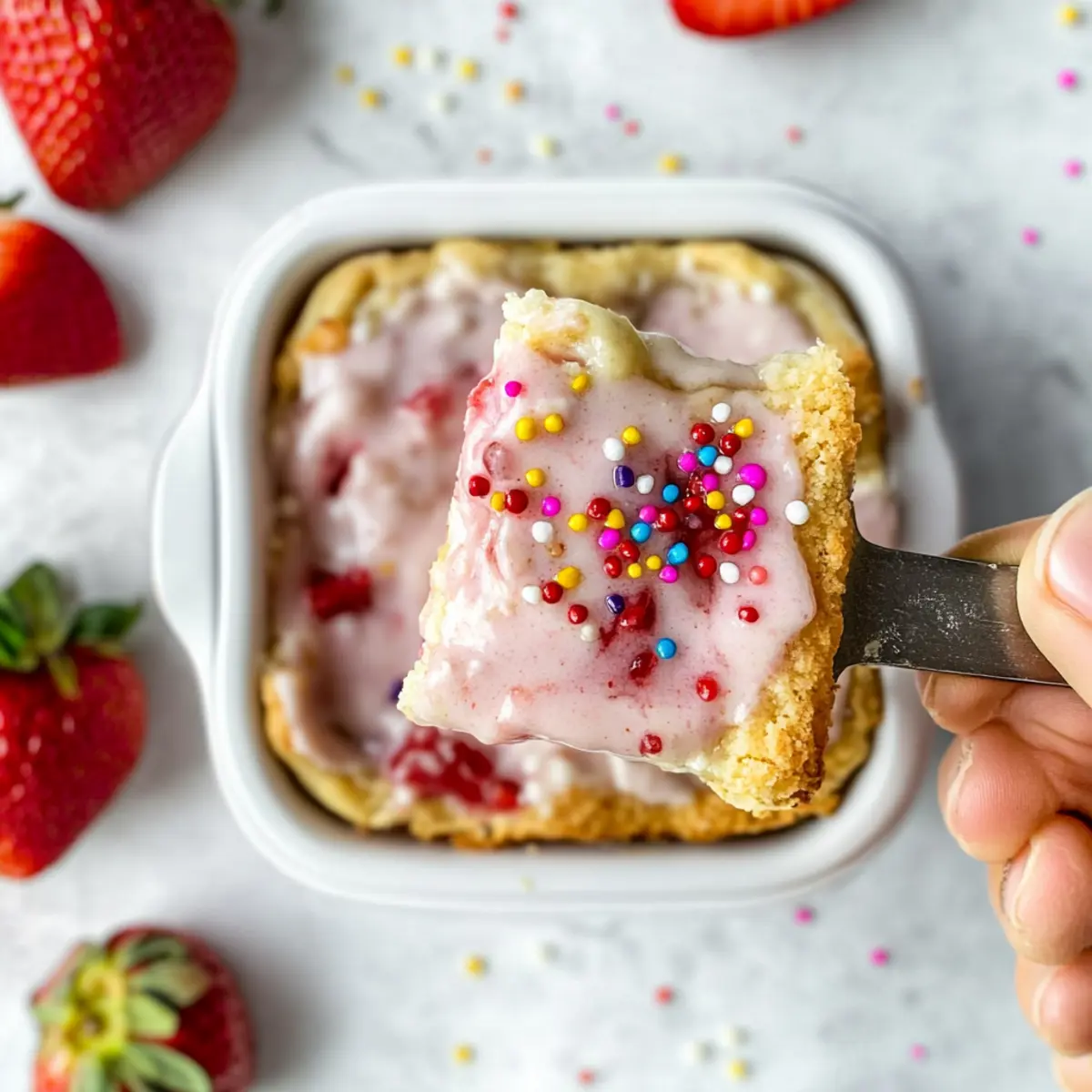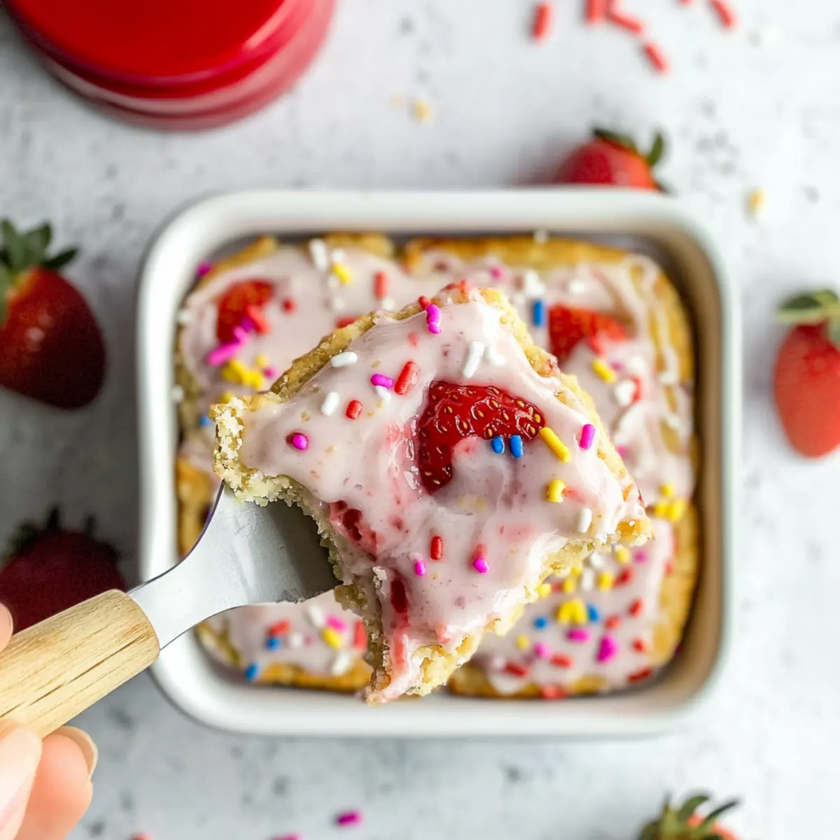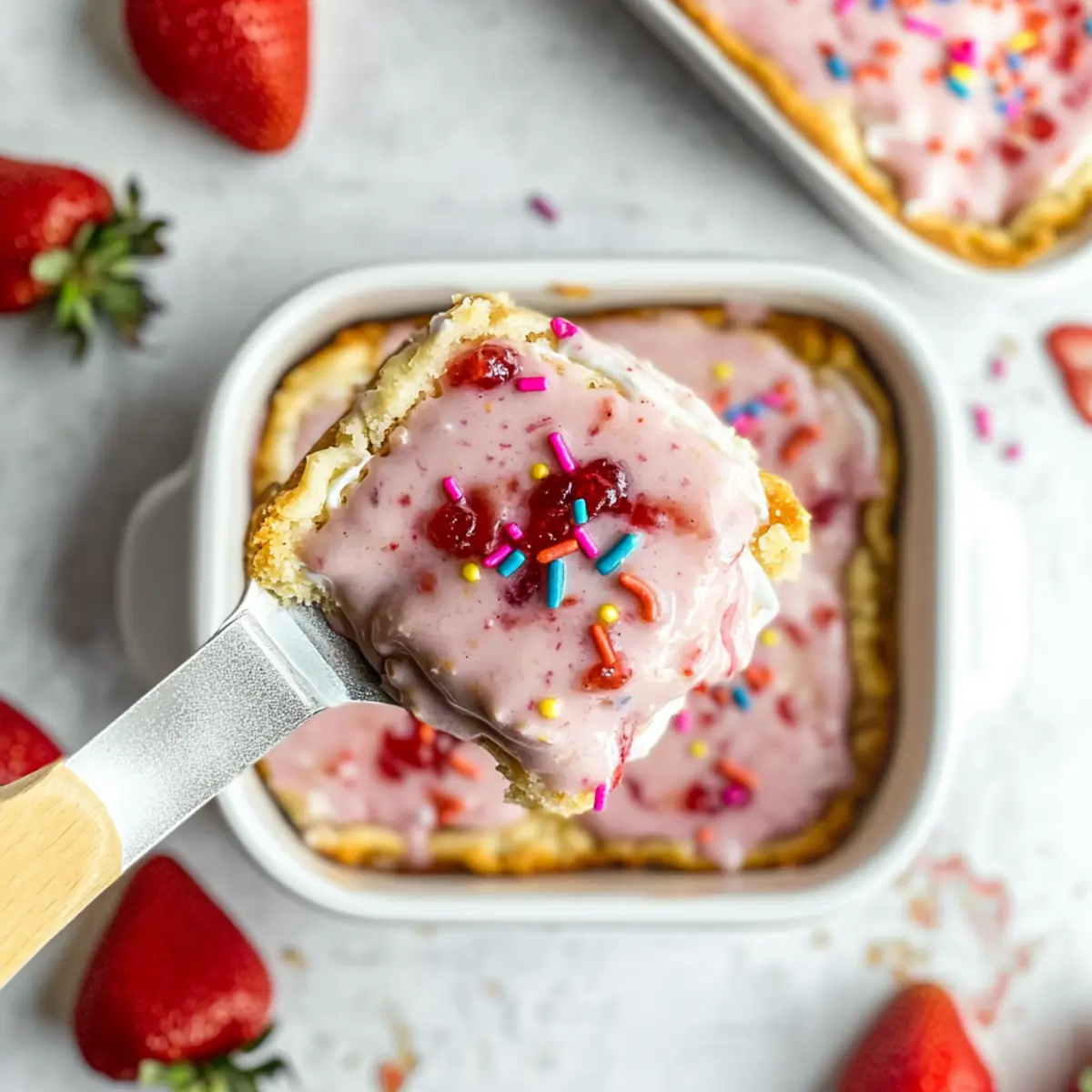 As the sun began to rise and fill my kitchen with warmth, I found myself craving something nostalgic yet health-conscious—a dish that sparks joy without sacrificing my goals. Enter the Strawberry Pop-Tart Protein Baked Oats! These delightful baked oats are a smart twist on a childhood favorite, offering all the sweet strawberry goodness topped with a velvety Greek yogurt frosting. Not only do these oats provide a whopping 20 grams of protein per serving, but they also come together in just 30 minutes, making them the perfect answer to busy mornings. Gluten-free options? Check! If you’re ready to indulge in a breakfast that’s both satisfying and nourishing, stick around—your taste buds are in for a treat! Shall we dive in? Why are these oats a breakfast game-changer? Nostalgic Delight: The sweet, fruity flavor of strawberry Pop-Tarts is perfectly recreated in a healthier form that will take you back to your childhood. High Protein Power: Packed with 20 grams of protein per serving, this breakfast dish not only satisfies but also fuels your morning activities. Quick and Easy: Ready in just 30 minutes, these baked oats fit smoothly into your busy schedule. Ideal for meal prep, or serve them fresh! Texture Fusion: Experience the tender, custardy inner layer paired with a creamy frosting that brings a beautiful contrast to every bite. Versatile Base: With options for gluten-free and vegan adaptations, these oats cater to various dietary needs, ensuring everyone can enjoy this delicious breakfast. Want a refreshing drink to accompany? Try making some Strawberry Lemonade Refreshing for that extra flavor boost! Strawberry Pop-Tart Protein Baked Oats Ingredients For the Oats Oat Flour – The main structure for these baked oats; swap with whole wheat flour or almond flour for a gluten-free option. Dymatize Elite Vanilla Casein Protein Powder – Adds a rich flavor and extra protein; any vanilla protein powder works splendidly if needed. Baking Powder – Ensures fluffiness in your baked oats; always check it’s fresh for the best rise. Salt – Balances sweetness and enhances all flavors, making your dish pop! Unsweetened Vanilla Almond Milk – Provides moisture and flavor; feel free to use any plant-based or regular milk instead. Eggs – Bind the mixture and impart richness; for a vegan option, opt for flax eggs instead. Maple Syrup – Natural sweetness to brighten the taste; honey or agave syrup can be a good substitute. Vanilla Extract – A fragrant enhancement that amplifies the sweetness of the dish. Low Sugar Strawberry Preserves – Delivers the quintessential strawberry flavor; substitute with any similar jam or puree you love. For the Frosting Powdered Sugar – Sweetens the frosting; can reduce the amount or replace with a sugar alternative as desired. Plain Non-Fat Greek Yogurt – The creamy base for your frosting, contributing protein; regular yogurt or a vegan substitute is just as delightful. With these Strawberry Pop-Tart Protein Baked Oats ingredients, you’re all set to whip up a breakfast that’s nourishing, delicious, and reminiscent of a sweet childhood treat! Step‑by‑Step Instructions for Strawberry Pop-Tart Protein Baked Oats Step 1: Preheat and Prepare Dishes Begin by preheating your oven to 350°F (175°C), allowing it to reach the perfect temperature for baking. While the oven warms up, prepare three half-quart baking dishes by spraying them generously with non-stick cooking spray. This will ensure the Strawberry Pop-Tart Protein Baked Oats don’t stick, allowing for easy removal once they’re baked. Step 2: Mix Dry Ingredients In a medium-sized bowl, combine the oat flour, Dymatize Elite Vanilla Casein Protein Powder, baking powder, and salt. Whisk these dry ingredients together until they are evenly mixed and free of clumps. This step is essential for ensuring your baked oats rise well and have an even texture throughout. Step 3: Combine Wet Ingredients In another bowl, mix together the unsweetened vanilla almond milk, eggs, maple syrup, and vanilla extract. Use a whisk to blend these ingredients well until you achieve a smooth consistency. This will create a moist base for your Strawberry Pop-Tart Protein Baked Oats, making them rich and flavorful. Step 4: Combine Wet and Dry Mixtures Gently fold the wet ingredients into the dry mixture. Stir until all the ingredients are just combined, and ensure there are no dry flour clumps remaining. The consistency should be thick and sticky, reminiscent of cookie dough. This unified batter will be the heart of your delicious baked oats. Step 5: Layer the Batter Spread half of the oat batter evenly across the bottom of your prepared baking dishes. Make sure to smooth it out for an even layer. Next, drop spoonfuls of low-sugar strawberry preserves on top, spreading it carefully while avoiding the edges. This will give your baked oats that delightful strawberry flavor throughout. Step 6: Add Remaining Batter Top the layer of preserves with the remaining batter, spreading it gently to cover the strawberry layer completely. This ensures that the Strawberry Pop-Tart Protein Baked Oats maintain all their flavors, hidden beneath that deliciously thick oat shell. It’s now ready for the oven! Step 7: Bake the Oats Place the baking dishes in your preheated oven and bake for 20 to 22 minutes. Keep an eye on them; they should puff up and turn a light golden brown. The center should spring back when gently touched, indicating that they are perfectly baked and ready to come out. Step 8: Cool the Baked Oats Once baked, remove the dishes from the oven and set them on a cooling rack. Allow your Strawberry Pop-Tart Protein Baked Oats to cool for a few minutes, as this makes them easier to frost. Patience is key here; letting them cool ensures the yogurt frosting doesn’t melt away. Step 9: Prepare the Frosting In a small bowl, whisk together the powdered sugar and plain non-fat Greek yogurt until the mixture is smooth and c
