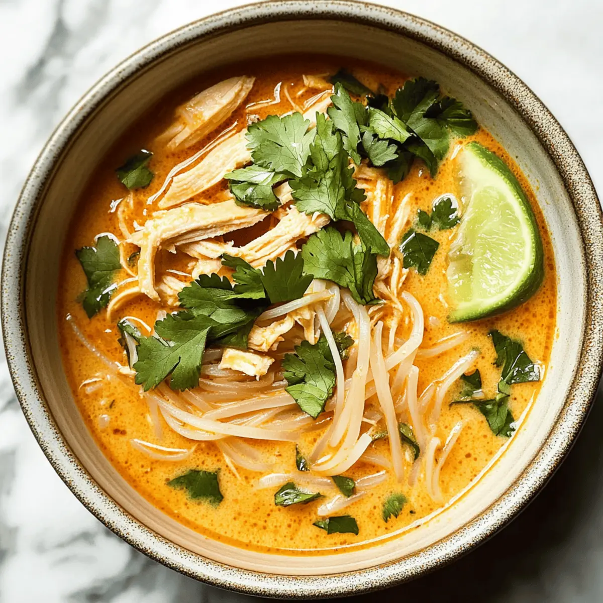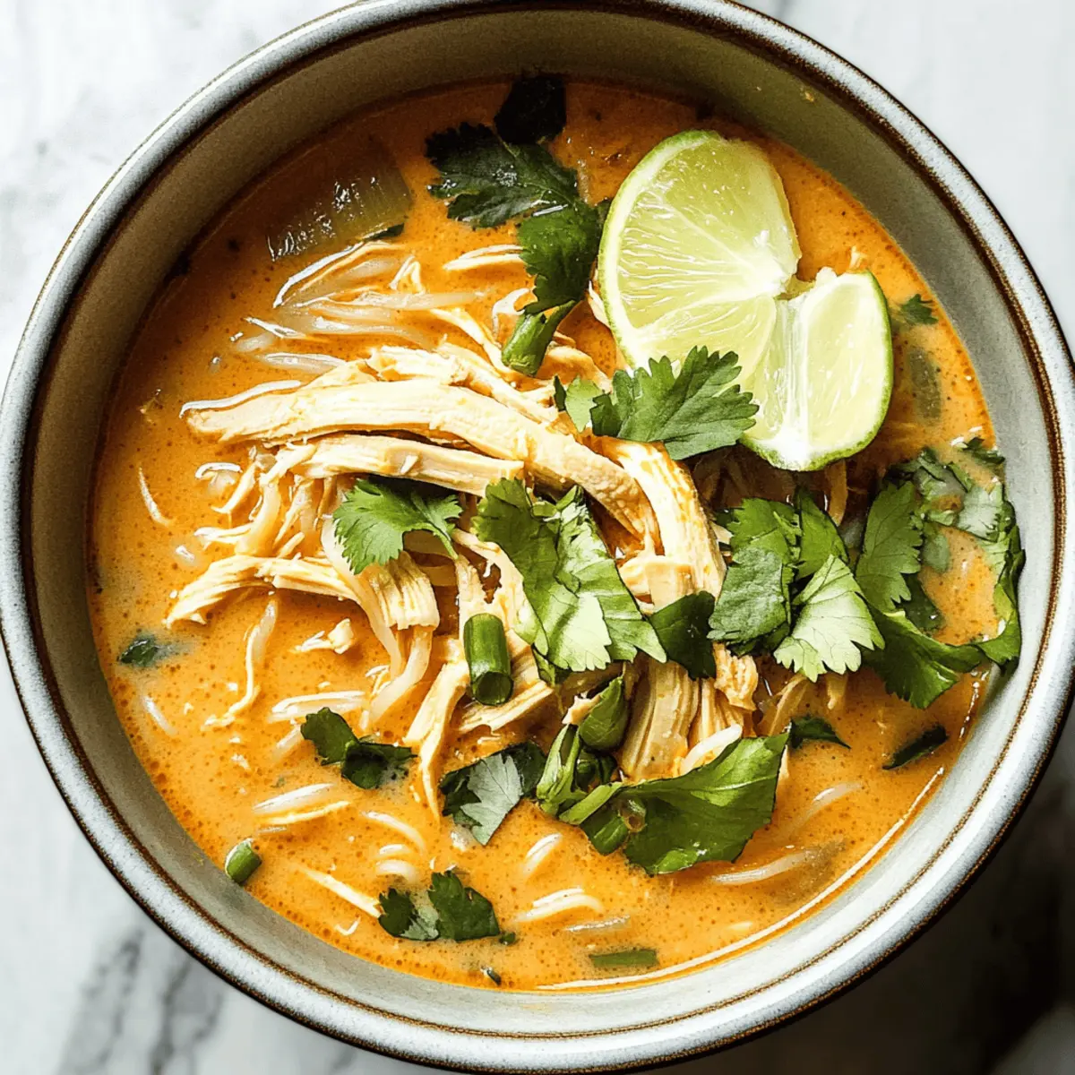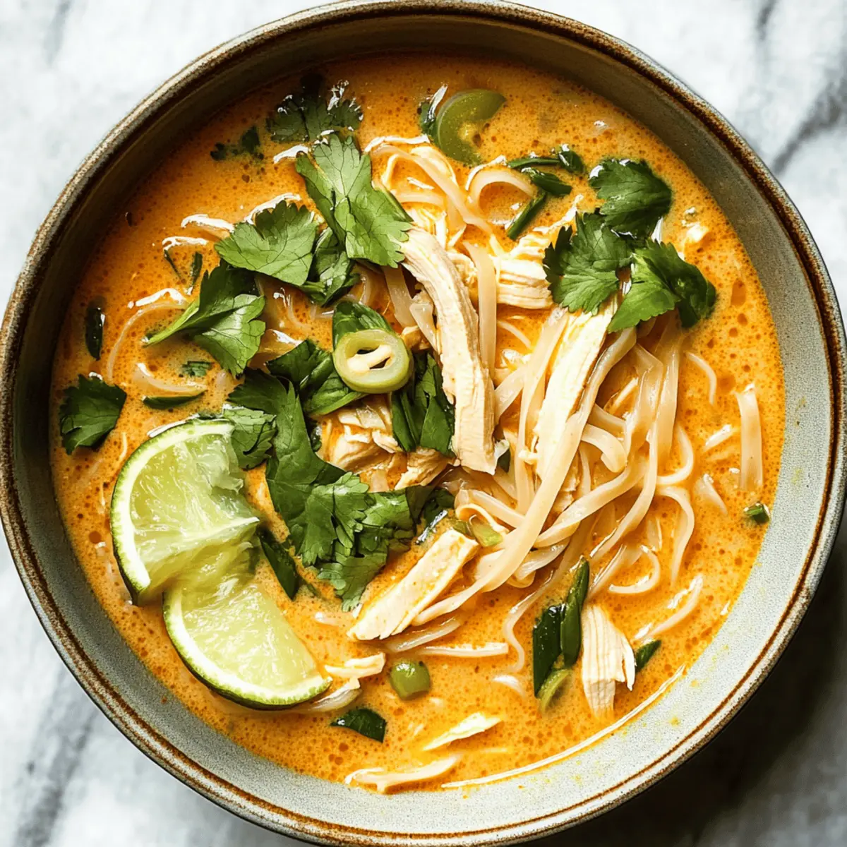 The warm aroma of spices wafting through the kitchen instantly transports me to the vibrant streets of Thailand. It’s during those moments that I crave a comforting bowl of Easy Thai Chicken Curry Soup—a dish that brings together the best of savory rotisserie chicken, rich coconut milk, and a medley of aromatic herbs. This quick, 20-minute meal not only caters to busy weeknights but also transforms leftover chicken into something extraordinary. With bursts of ginger and a splash of zesty lime, this soup is a delightful way to shake off meal fatigue and indulge in a satisfying flavor fiesta. Curious about how to whip this up in no time? Let’s dive into the recipe! Why is this Thai Chicken Curry Soup special? Comforting and Quick: This Easy Thai Chicken Curry Soup is ready in just 20 minutes, making it the ultimate weeknight meal. Rich, Tropical Flavor: The blend of coconut milk and fragrant spices creates a creamy, mouthwatering experience that will transport your taste buds straight to Thailand. Rotisserie Chicken Magic: Using leftover or rotisserie chicken means less prep time, allowing you to enjoy a gourmet taste with minimal effort. Versatile Delight: Feel free to customize with vegetables like bell peppers or snap peas for added nutrition and color! Satisfying and Wholesome: Each bowl is a balanced meal, delivering warmth and comfort without the heaviness—perfect for busy nights or chilly days. Try pairing it with a fresh side salad or some crusty bread to round out your meal! Thai Chicken Curry Soup Ingredients For the Soup Base Olive Oil – For sautéing; adds richness to the dish. Onion – Provides sweetness and depth; can substitute with shallots for a milder flavor. Grated Fresh Ginger – Adds a warm, spicy flavor; ground ginger works in a pinch. Garlic – Enhances overall flavor; always best to use fresh. Thai Red Curry Paste – The main flavor base; adjust quantity for desired heat level. Chicken or Vegetable Broth – Acts as the liquid base; go for low-sodium broth if watching your salt intake. Water – Used to balance the flavors; adjust based on how thick you want your soup. Lime Juice – Adds bright acidity; lemon juice makes a decent substitute if needed. For the Noodles & Creaminess Rice Noodles – Provide structure and heartiness; thicker noodles work better for texture. Full Fat Coconut Milk – Brings creaminess and richness; opt for low-fat coconut milk for a lighter twist. Shredded Cooked Chicken (rotisserie) – Main protein source; leftover chicken is perfect for this recipe. For the Fresh Finish Fresh Basil – Delivers fragrance and flavor; Thai basil is an excellent alternative. Cilantro – Adds a refreshing note; can be omitted if you prefer a different herb. Chopped Scallions – Great garnish and mild onion flavor; chives can also work well here. For Seasoning & Garnishing Salt & Pepper – Essential for enhancing flavor; season to taste for the best results. Lime Wedges – For serving; optional, but gives a fantastic zing to the soup. Step‑by‑Step Instructions for Easy Thai Chicken Curry Soup Step 1: Sauté Aromatics In a large pot, heat a tablespoon of olive oil over medium-high heat. Once hot, add chopped onion and sauté for about 5 minutes until it becomes translucent and slightly browned. You want to see the onions softened and fragrant, forming a savory base for your Easy Thai Chicken Curry Soup. Step 2: Add Flavor Boosters Stir in the grated fresh ginger, minced garlic, and 2 tablespoons of Thai red curry paste. Continue to sauté for another 30 seconds, allowing the spices to bloom and fill your kitchen with a warm, aromatic scent. This step infuses the soup with essential flavors that will elevate your dish. Step 3: Create the Soup Base Pour in 4 cups of chicken or vegetable broth and 1 cup of water, stirring to combine. Add the juice of 1 lime to brighten the flavors. Bring the mixture to a gentle boil over medium heat; watch for bubbles to break the surface, indicating it’s ready for the next step. Step 4: Cook the Noodles Once boiling, add in the rice noodles to the pot. Stir well and cook according to the noodle package instructions, typically around 4-5 minutes, until they are tender and have absorbed some of the broth’s flavor. You’ll know they’re done when they’re soft but still firm to the bite. Step 5: Add Creaminess and Chicken Lower the heat to a simmer and stir in one can of full-fat coconut milk and 2 cups of shredded cooked chicken. Let the soup simmer for about 10 minutes, allowing the flavors to meld together and the soup to become rich and creamy. This is the heart of your Easy Thai Chicken Curry Soup. Step 6: Finish with Fresh Herbs In the final moments of cooking, add a handful of torn fresh basil, chopped cilantro, and scallions. Season with salt and pepper to taste, enhancing the depth of flavor. Allow the herbs to wilt slightly, bringing freshness to your comforting soup just before serving. Step 7: Serve with a Twist Ladle the Easy Thai Chicken Curry Soup into bowls and garnish with lime wedges on the side for an extra zesty kick. The vibrant colors and creamy texture will entice your family, making it a perfect choice for a cozy meal. Enjoy the wonderful contrasts of flavors in every spoonful! How to Store and Freeze Thai Chicken Curry Soup Fridge: Store leftover Thai Chicken Curry Soup in an airtight container for up to 3–4 days. The flavors will meld beautifully overnight, creating even more deliciousness. Freezer: You can freeze the soup for up to 3 months. Allow it to cool completely before transferring to freezer-safe bags or containers, leaving room for expansion. Reheating: When ready to enjoy, thaw in the fridge overnight or reheat directly from the freezer on the stovetop over medium heat. Add a splash of broth to maintain the creamy consistency. Assembly Tip: If you plan to freeze, consider storing the rice noodles separately, as they may become mushy over time. Mix them in just 