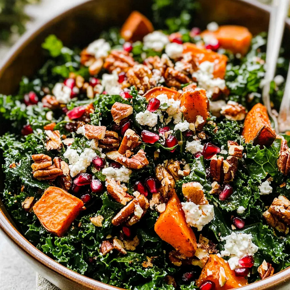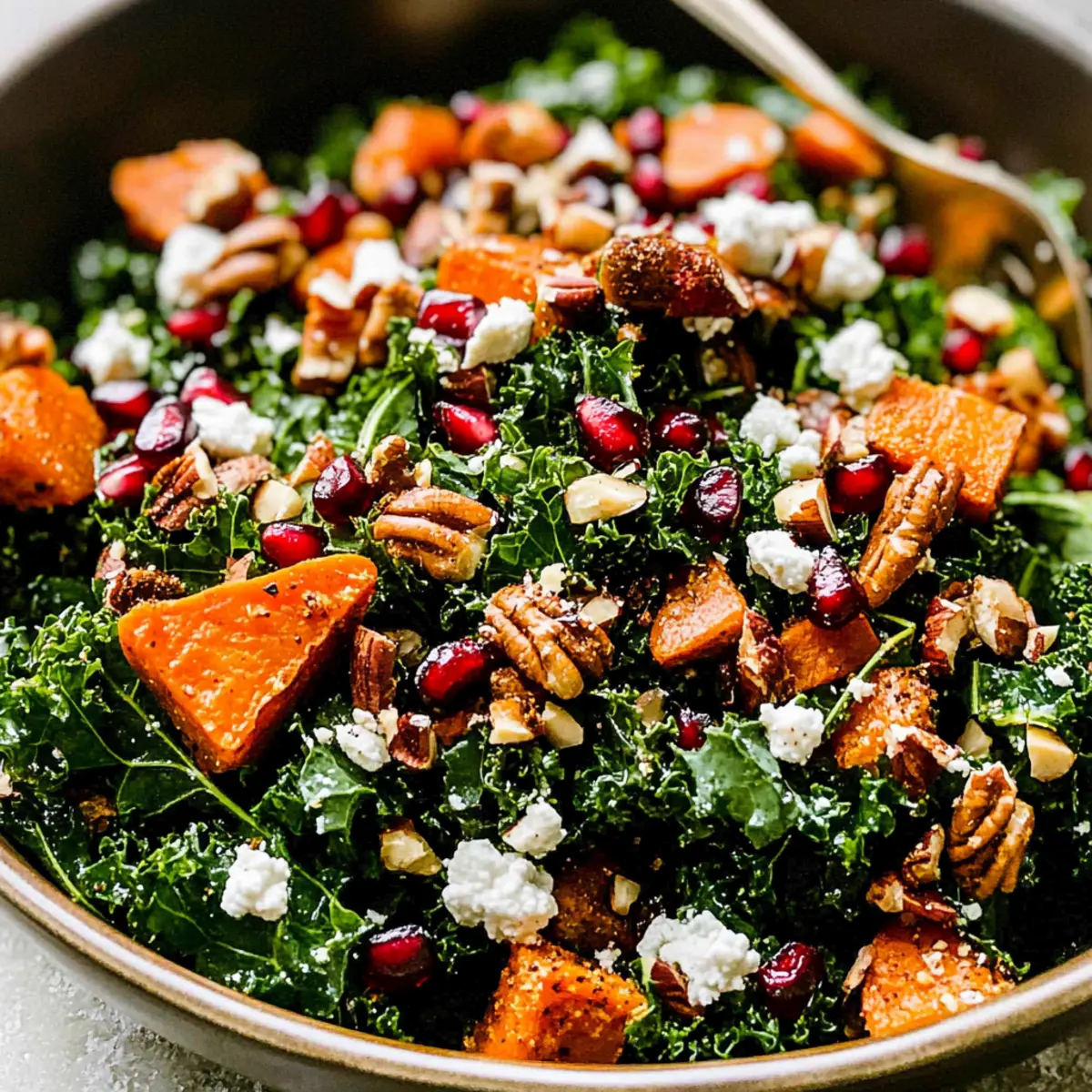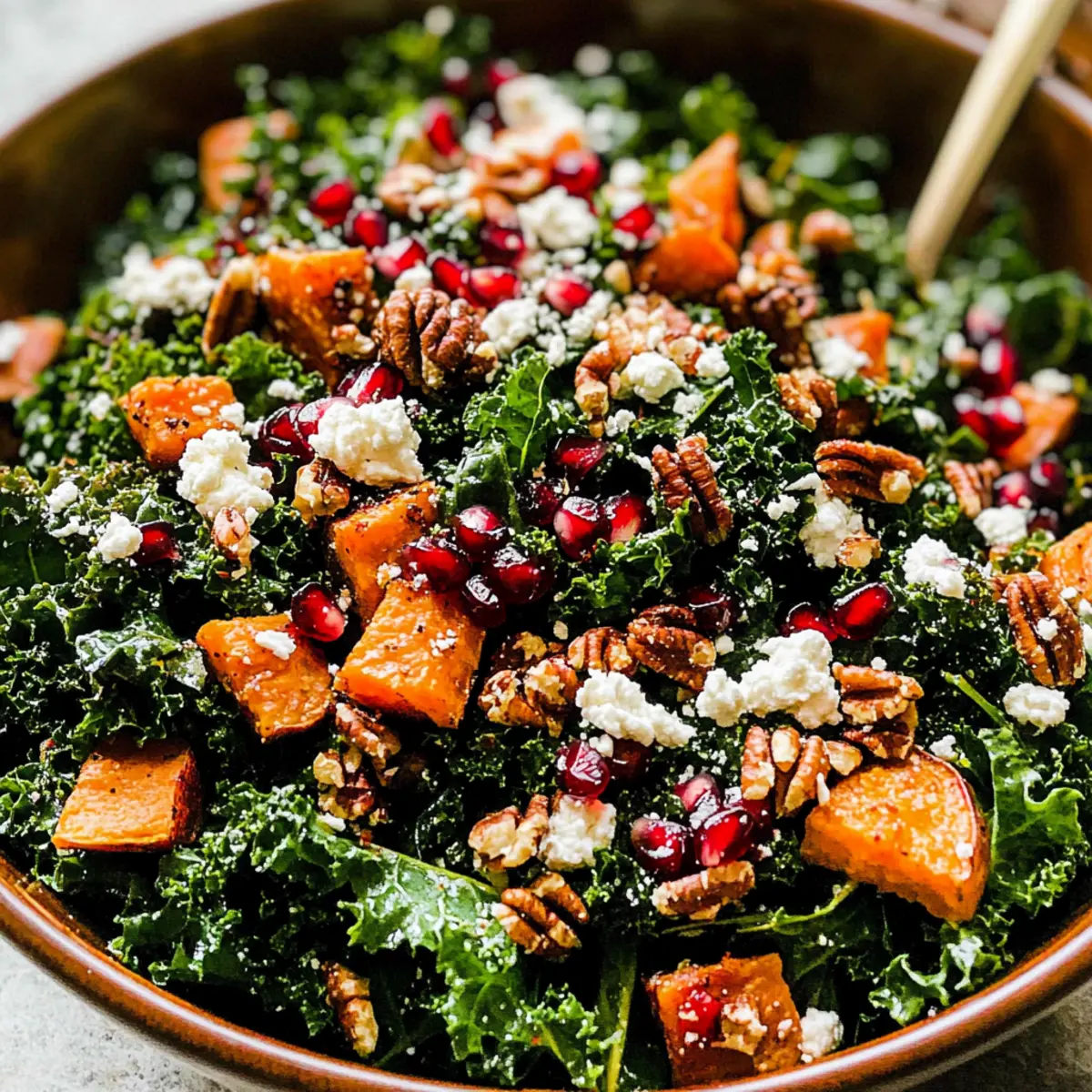 As I sliced into the warm sweet potatoes, the aroma of cinnamon and maple filled my kitchen, whisking me away to the beloved holidays of my childhood. This Thanksgiving Salad with Cinnamon Cider Vinaigrette captures that nostalgic essence, mixing hearty massaged kale with tender roasted sweet potatoes, crunchy maple-spiced nuts, and vibrant pomegranate arils. Not only is it a stunning centerpiece for your holiday table, but it’s also make-ahead friendly—perfect for easing the stress of Thanksgiving preparations. This salad is vegetarian, gluten-free, and oh-so satisfying, making it a delightful addition to any festive feast. Are you ready to elevate your Thanksgiving spread with this colorful, seasonal delight? How can this Thanksgiving salad shine? Simplicity, preparing this salad is a breeze, allowing you to whip it up in no time. Vibrant flavors unite through sweet roasted potatoes, tangy pomegranate, and a warm cinnamon cider vinaigrette. Make-ahead friendly, it lets you prep ingredients in advance, ensuring you can enjoy the holiday without a last-minute rush. Versatile pairing, it beautifully complements classics like turkey or ham, but stands strong as a light main dish too. Nutritious elegance comes through in every bite, boasting fiber, healthy fats, and a satisfying crunch. Elevate your feast with this salad that captures the holidays perfectly! Thanksgiving Salad with Cinnamon Cider Vinaigrette Ingredients For the Salad Kale – The vibrant green base packed with nutrients and texture; opt for fresh kale over pre-packaged versions for better flavor. Wild Rice – Adds a hearty, chewy element; feel free to substitute with quinoa for a lighter option. Sweet Potatoes – Offers natural sweetness and stunning color; you can swap these with butternut squash if you prefer. Nuts (Walnuts/Pecans) – Provide a delightful crunch and nuttiness; almonds or sunflower seeds work well for a nut-free version. Pomegranate Arils – Fresh bursts of sweetness and color that enhance the dish; alternatives like cranberries add a different twist. Goat Cheese or Feta – For a creamy touch; omit for a vegan option or replace it with avocado for a similar richness. For the Vinaigrette Olive Oil – Forms the base of the dressing, adding richness; use high-quality oil for the best flavor. Apple Cider Vinegar – Brings a bright acidity to balance the sweetness; balsamic vinegar could be a suitable alternative. Maple Syrup – Sweetens the vinaigrette with a warm flavor; honey can be used instead for a slightly different taste. Spices (Chili Powder, Cumin, Cinnamon, Cayenne) – Add warmth and depth; adjust according to your spice preference. This Thanksgiving Salad with Cinnamon Cider Vinaigrette is guaranteed to be a crowd-pleaser! Step‑by‑Step Instructions for Thanksgiving Salad with Cinnamon Cider Vinaigrette Step 1: Preheat the Oven Begin by preheating your oven to 425°F (220°C). While the oven warms, line two baking sheets with parchment paper to ensure an easy cleanup after roasting those beautifully vibrant sweet potatoes. This step sets the stage for caramelizing the natural sugars, enhancing the flavors of your Thanksgiving Salad with Cinnamon Cider Vinaigrette. Step 2: Cook the Wild Rice In a medium saucepan, cook wild rice according to the package instructions, which typically takes about 40–45 minutes. Bring the water to a boil and then reduce to a simmer, covering the pot. Once cooked, drain any excess water and fluff the rice with a fork. Set it aside to cool while preparing the other elements of your salad. Step 3: Roast the Sweet Potatoes Peel and dice the sweet potatoes into 1-inch cubes, then toss them in a large mixing bowl with olive oil, maple syrup, chili powder, cumin, cinnamon, and cayenne. Spread the seasoned sweet potatoes evenly on the prepared baking sheets and roast for 25–30 minutes, flipping halfway through, until they are fork-tender and caramelized at the edges—a perfect addition to your Thanksgiving Salad. Step 4: Toast the Nuts While the sweet potatoes are roasting, place your choice of walnuts or pecans in a skillet over medium heat. Drizzle a little maple syrup and sprinkle additional chili powder and cinnamon over the nuts. Toast them for about 4 minutes, stirring frequently, until they are fragrant and golden brown. Remove from heat and allow them to cool, ensuring a delightful crunch in your salad. Step 5: Prepare the Vinaigrette In a small bowl, whisk together olive oil, apple cider vinegar, maple syrup, and spices until well combined. Taste and adjust the seasoning if desired, feeling the warmth of cinnamon and sweetness of maple come together. This vinaigrette is the key to elevating your Thanksgiving Salad with Cinnamon Cider Vinaigrette, balancing the flavors beautifully. Step 6: Massage the Kale In a large bowl, add the chopped kale. Drizzle about half of the vinaigrette over the kale and use your hands to massage it gently for 2–3 minutes. This process breaks down the tough fibers, making the kale tender and flavorful. Once massaged, it serves as a hearty foundation for your Thanksgiving Salad. Step 7: Assemble the Salad Now it’s time to bring your Thanksgiving Salad with Cinnamon Cider Vinaigrette together! Layer the massaged kale with the cooked wild rice, roasted sweet potatoes, toasted nuts, and the vibrant pomegranate arils. Crumble goat cheese or feta over the top, adding a creamy richness that compliments the crunch and sweetness of the other ingredients. Step 8: Drizzle with Vinaigrette and Serve Finally, drizzle the remaining vinaigrette over the assembled salad, giving it one last gentle toss to combine all the flavors. Serve immediately, or for a make-ahead option, cover and refrigerate for up to several hours. This beautifully presented salad is both visually stunning and utterly delicious—a showstopper at your Thanksgiving table! How to Store and Freeze Thanksgiving Salad Fridge: Store dressed salad in an airtight conta