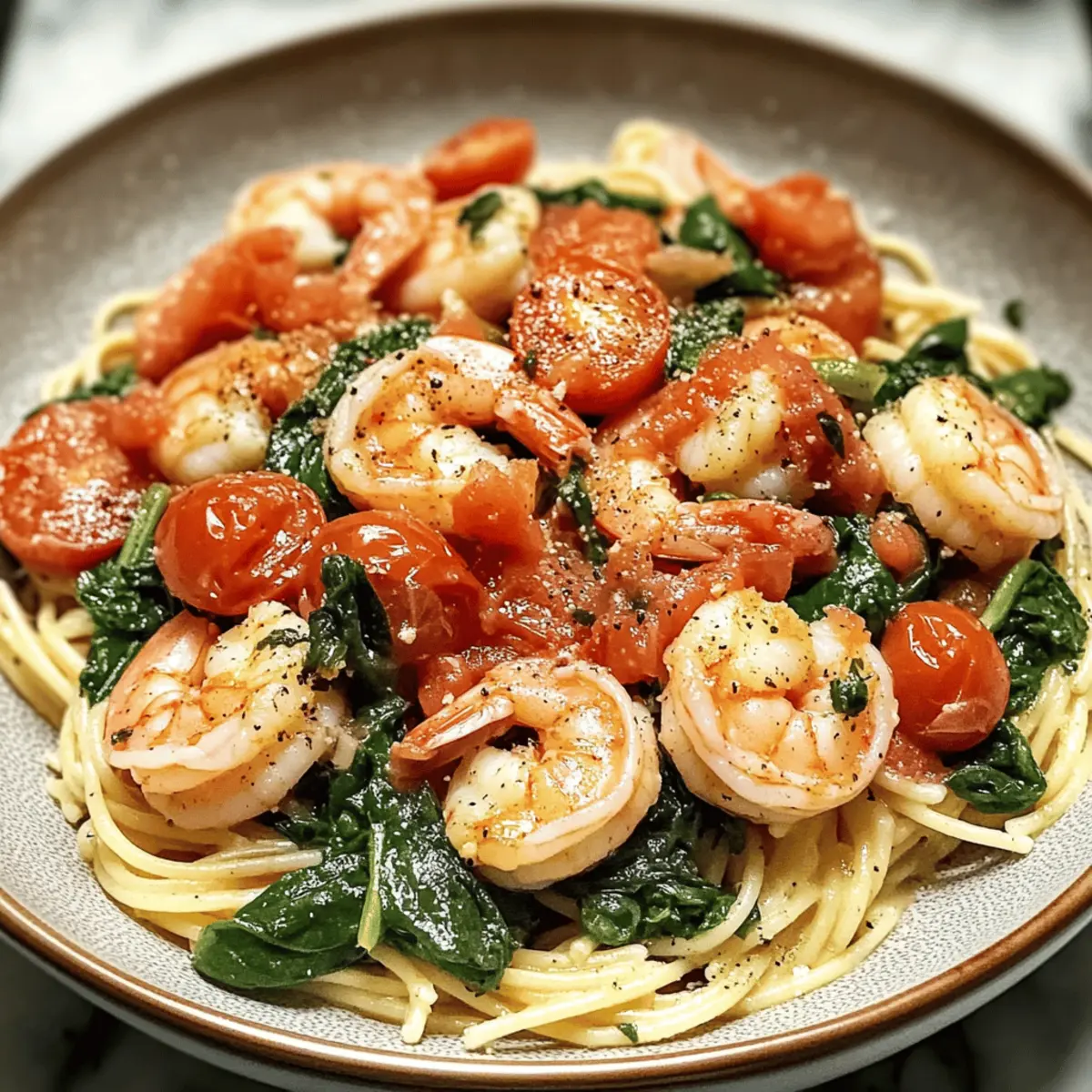 Prepare a quick and delightful Tomato Spinach Shrimp Pasta, ready in just 30 minutes for a satisfying dinner.