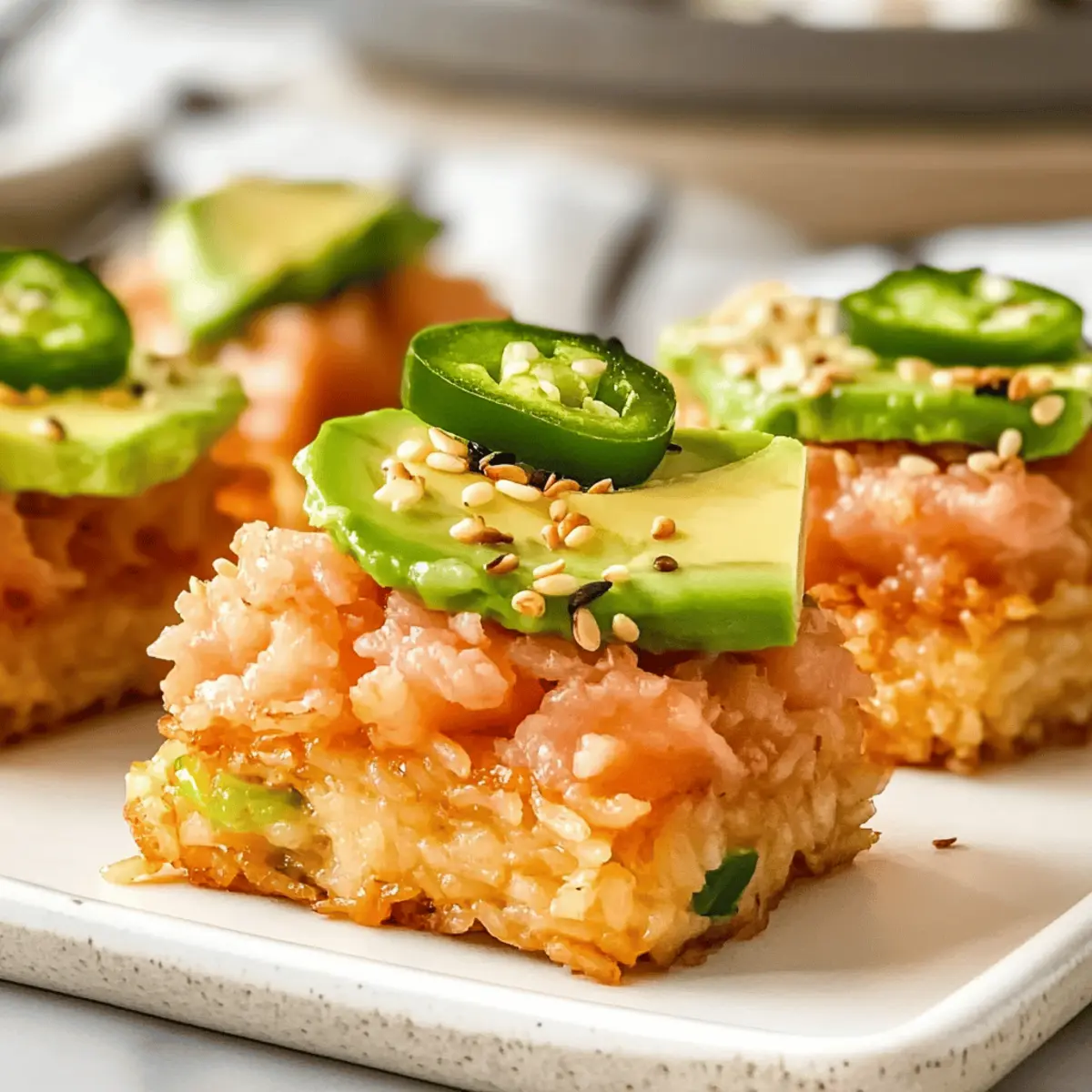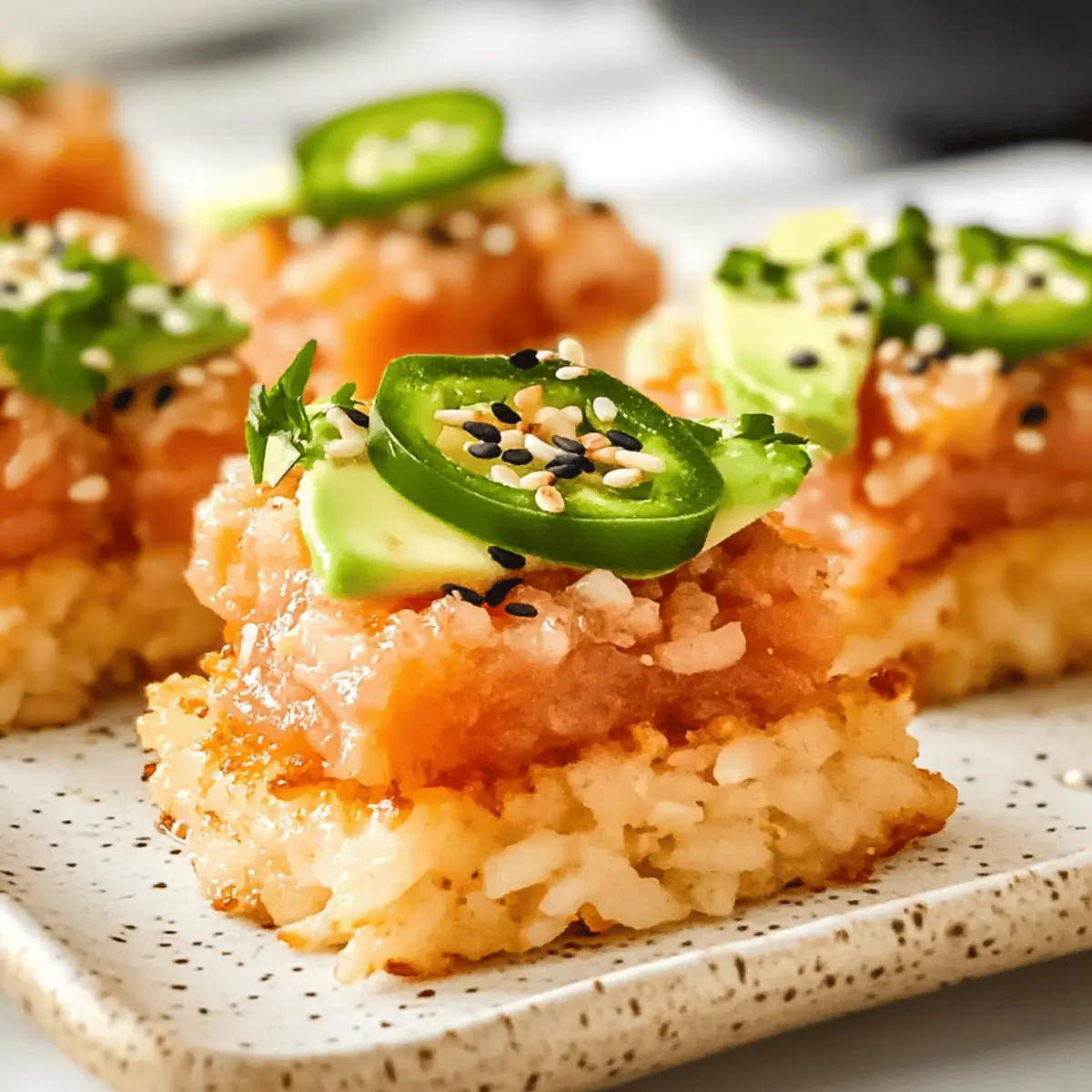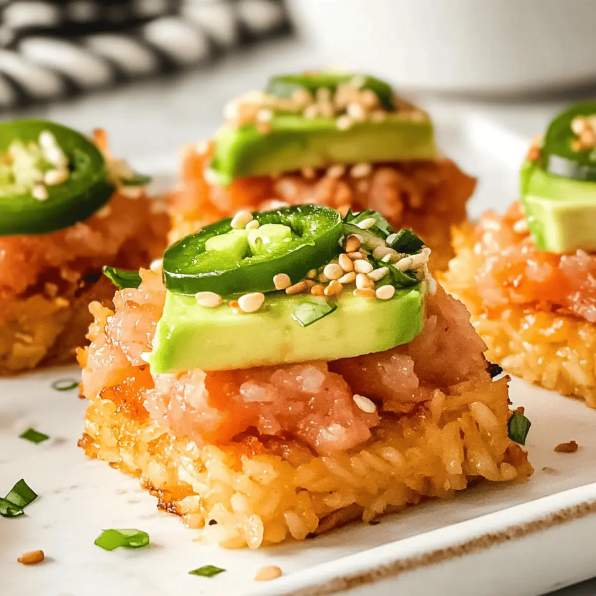 The first crunch is a revelation—a delightful contrast to the creamy, spicy tuna gliding smoothly over the crispy rice. My homemade Spicy Tuna Crispy Rice recipe, inspired by the elegance of Nobu, isn’t just another appetizer; it’s a vibrant, flavorful experience that’s both quick to prepare and a guaranteed crowd-pleaser! Picture crispy rectangles of expertly seasoned sushi rice topped with fresh avocado and a kick of jalapeño, all customizable to your preferred heat level. Whether you’re entertaining guests or simply treating yourself, this dish brings gourmet appeal to your kitchen without the hefty price tag. Curious to learn how to recreate this mouthwatering masterpiece? Let’s dive into the details! Why will you love this Tuna Crispy Rice? Crispy Texture: The golden-brown exterior provides an irresistible crunch that perfectly contrasts the creamy topping. Rich, Umami Flavor: Every bite bursts with savory goodness from the sushi-grade tuna mixed with Kewpie mayo and Sriracha. Customizable Heat: Adjust the spice level easily by tweaking the Sriracha or adding fresh jalapeños for a bold kick. Gourmet Experience: Enjoy an upscale dish typically found in fine dining right from your own kitchen! Quick to Prepare: With simple steps and just a bit of time, you’ll create a stunning appetizer that leaves guests impressed. Pair your Tuna Crispy Rice with other delightful dishes like Honey Butter Rice or the flavorful Corn Chicken Rice for a complete meal! Tuna Crispy Rice Ingredients For the Sushi Rice • Sushi Rice – The foundation of this Tuna Crispy Rice; rinse thoroughly until water is clear to ensure the perfect texture. • Water – Essential for cooking the sushi rice properly. • Salt – Enhances the flavor of the sushi rice during cooking. • Rice Vinegar – Adds a tangy kick to the sushi rice; seasoning is recommended for sushi. • Granulated Sugar – Balances the vinegar’s acidity for a flavorful rice base. • Sesame Oil – Infuses a nutty depth into the sushi rice for added richness. For the Spicy Tuna Mixture • Ahi Tuna (sushi-grade) – The star of this dish, finely chopped for a creamy, rich topping. • Japanese Kewpie Mayonnaise – Brings a luscious creaminess and umami flavor to the spicy mix. • Sriracha – Adds heat; adjust the amount based on your preferred spice level. • Soy Sauce – Elevates the umami depth; choose a high-quality variety. • Lime Juice – Brightens the flavors of the spicy tuna for a zesty finish. For Toppings & Garnish • Avocado – Fresh slices provide creamy richness that complements the crispy rice. • Toasted Sesame Seeds – Offers a delightful crunch for topping. • Chives or Scallions – Minced for a fresh touch and added flavor. • Jalapeño or Serrano Pepper – Sliced to add a spicy kick if desired. This Tuna Crispy Rice recipe promises a quick and decadent experience that you can customize to your liking! Step‑by‑Step Instructions for Spicy Tuna Crispy Rice Step 1: Prepare the Sushi Rice Start by rinsing 1 cup of sushi rice under cold water until the water runs clear, removing excess starch. Next, cook the rinsed rice in a rice cooker with 1 ¼ cups of water and a pinch of salt. Cook according to the rice cooker instructions, usually about 20 minutes, until the rice is tender and sticky. Step 2: Flavor the Rice In a small bowl, mix 2 tablespoons of rice vinegar, 1 tablespoon of granulated sugar, and 1 teaspoon of sesame oil until fully dissolved. Once the sushi rice is cooked, transfer it to a large mixing bowl and gently fold in the vinegar mixture with a spatula. This step enhances the rice’s flavor, making it perfect for your Tuna Crispy Rice. Step 3: Shape the Rice Line a baking tray with parchment paper and spread the seasoned rice evenly on it, pressing it down to form a ½-inch thick layer. Cover the tray with plastic wrap and chill it in the refrigerator for at least 1 hour. Chilling the rice helps it firm up, making it easier to cut into rectangles later. Step 4: Cut the Rice After chilling, remove the tray from the refrigerator. Using a sharp knife, cut the rice into bite-sized rectangles, approximately 2 inches by 1 inch. Ensure the cuts are clean and the rice holds its shape, as these will be the base for your crispy tuna bites. Step 5: Pan-Fry the Rice In a large skillet, heat about ½ inch of vegetable oil over medium heat until shimmering but not smoking, around 350°F. Carefully add the rice rectangles, frying them for 3-5 minutes on each side until they are golden brown and crispy. Once cooked, transfer them to a wire rack to drain any excess oil. Step 6: Make the Spicy Tuna Mixture While the rice cools, prepare the spicy tuna mixture. In a medium bowl, combine 6 ounces of finely chopped sushi-grade ahi tuna, 3 tablespoons of Kewpie mayonnaise, 1 tablespoon of Sriracha, 1 teaspoon of soy sauce, 1 teaspoon of sesame oil, and the juice of half a lime. Mix well until everything is incorporated and set aside. Step 7: Assemble the Dish To assemble your Spicy Tuna Crispy Rice, place a slice of avocado on each crispy rice rectangle. Top generously with the spicy tuna mixture, ensuring it’s evenly distributed. Finish by sprinkling with toasted sesame seeds, minced chives, and sliced jalapeño or serrano pepper to add freshness and an extra kick. Make Ahead Options These Spicy Tuna Crispy Rice bites are perfect for meal prep, allowing you to enjoy a gourmet experience with minimal last-minute effort! You can prepare the sushi rice and form it into rectangles up to 24 hours in advance; simply keep them covered in the refrigerator to maintain their quality. Additionally, the spicy tuna mixture can be made a day ahead and stored in an airtight container; this not only enhances the flavors but also saves you precious time. When you’re ready to serve, pan-fry the rice rectangles and layer on the avocado and spicy tuna just before serving, ensuring you still achieve that delightful c