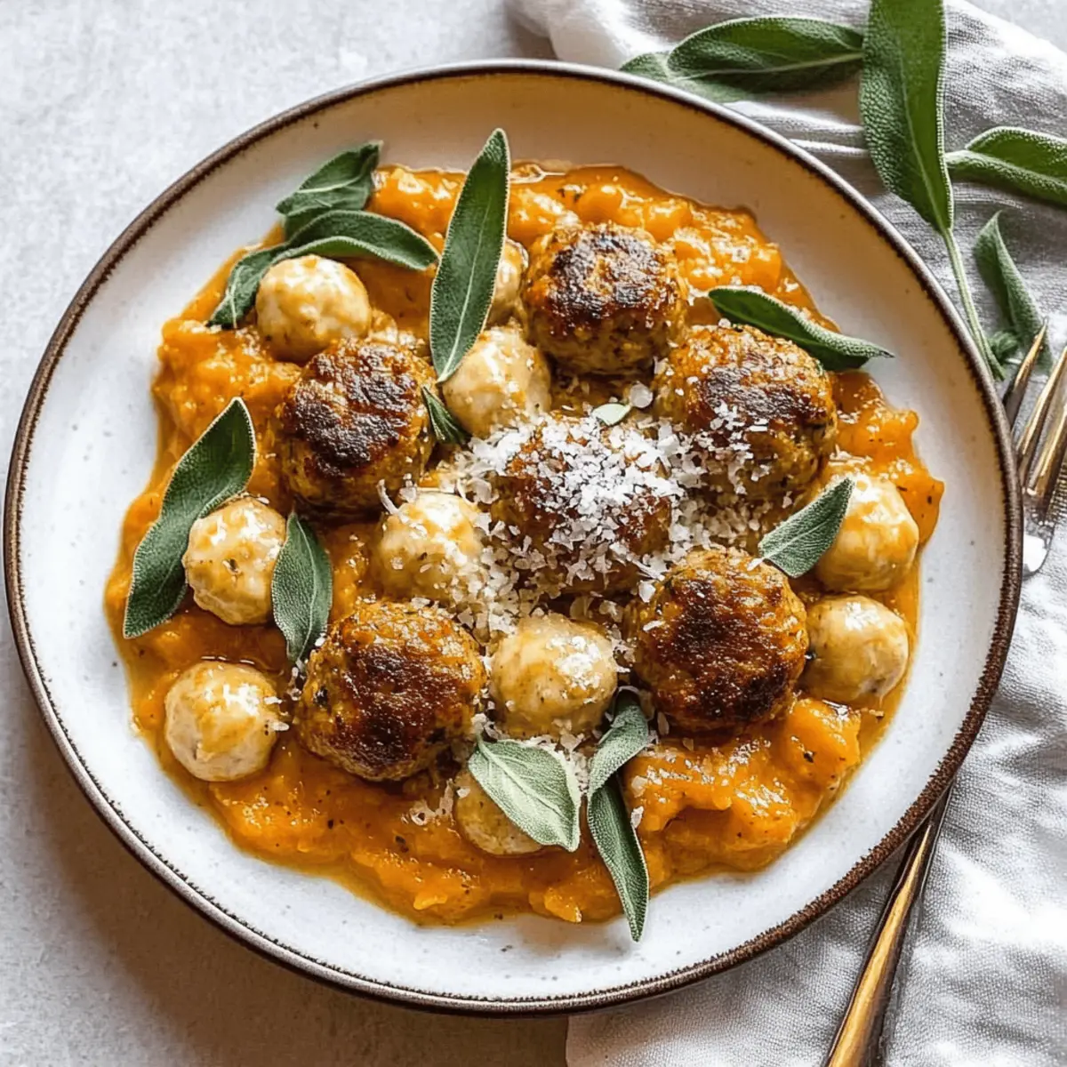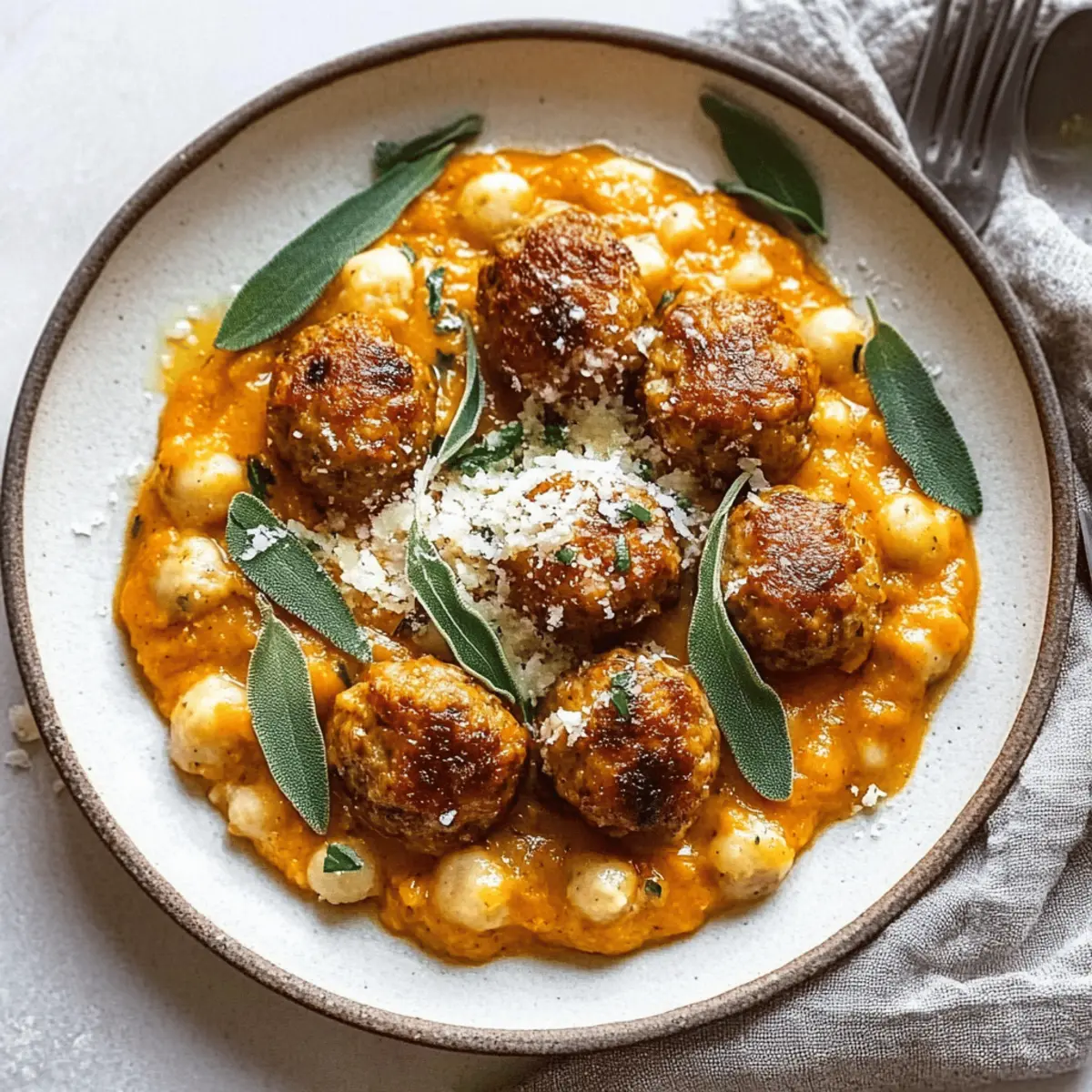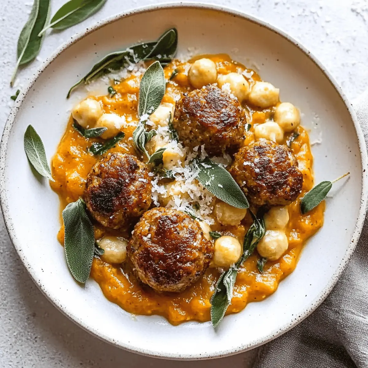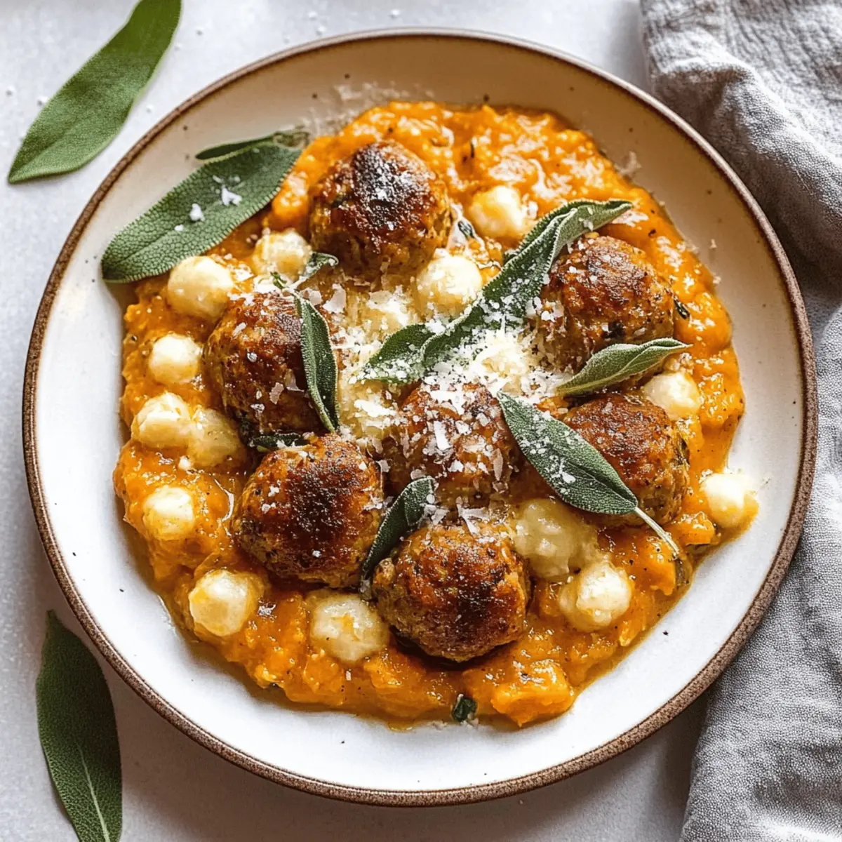 As the first hints of autumn chill the air, I find myself yearning for that perfect bowl of comfort. Enter my Juicy Turkey Meatballs in Creamy Pumpkin Sage Sauce, a dish that beautifully merges the heartiness of turkey with the velvety warmth of pumpkin. Not only is this recipe a cinch to whip up on busy evenings, but it also brings a nutritious twist to your table, perfect for gathering around with loved ones. With every bite, you’ll savor the rich flavors of sage and the creamy texture that hugs those succulent meatballs like a favorite sweater. Ready to embrace the cozy season? Let’s dive into this delicious recipe and fill our kitchens with warm, inviting aromas! Why Are These Meatballs So Irresistible? Savory Comfort: This recipe captures autumn’s essence, combining turkey with pumpkin for a cozy dish that warms your soul. Nutritious Twist: Enjoy hearty meatballs that don’t skimp on health. Lean turkey and pumpkin pack a nutritious punch without sacrificing flavor. Quick & Easy: With straightforward steps, you’ll have a delicious meal ready in no time. Perfect for busy weeknights! Flavor Explosion: The blend of fresh sage and creamy pumpkin elevates classic meatballs to gourmet status—ideal for impressing guests or livening up family dinners. Versatile: Pair these meatballs with gnocchi, polenta, or even serve over a bed of fresh arugula for a delightful twist. Ready to transform your dinner routine? Try these delightful meatballs today and enjoy an enchanting blend of flavors! Take a peek at our Sausage Egg Breakfast for another comfort food favorite! Turkey Meatballs in Pumpkin Sage Sauce Ingredients For the Meatballs Ground Turkey – Provides a lean protein base for meatballs; swap with chicken or plant-based ground meat if desired. Fresh Breadcrumbs – Adds structure and moisture; soaked in milk for extra tenderness; panko makes a great substitute. Milk – Helps to soak breadcrumbs for optimal moisture; non-dairy milk can be used for a vegan option. Garlic, Minced – Packs a flavorful punch; garlic powder can substitute in a pinch. Onion, Finely Minced – Infuses sweetness and moisture into meatballs; shallots can be a milder alternative. Fresh Sage – Delivers that quintessential fall flavor; fresh is preferred for intensity over dried. Italian Seasoning – Blends essential herbs that complement turkey beautifully. Parmesan Cheese – Adds rich, savory depth; nutritional yeast can work for a plant-based alternative. Egg – Binds the ingredients together keeping meatballs tender; a flax egg is a vegan swap. For the Sauce Canned Pumpkin Puree – Creamy base with a seasonal touch; homemade puree is a delightful alternative! Heavy Cream – Enriches the sauce; coconut cream can lighten it up for a healthier option. Additional Parmesan – For garnishing and enhancing the flavor profile of the sauce. Embrace the cozy flavors of these Turkey Meatballs in Pumpkin Sage Sauce and let your kitchen fill with warmth! Step‑by‑Step Instructions for Turkey Meatballs in Pumpkin Sage Sauce Step 1: Prepare Meatball Mixture In a large mixing bowl, combine 1 pound of ground turkey, soaked fresh breadcrumbs, minced onion, garlic, egg, chopped fresh sage, Italian seasoning, and grated Parmesan cheese. Mix gently with your hands until just combined, being careful not to overwork the meat to ensure tender meatballs. Set the mixture aside to allow the flavors to meld for about 10 minutes. Step 2: Form Meatballs With damp hands to prevent sticking, scoop small amounts of the meat mixture and roll them into meatballs about 1.5 inches in diameter. Place the formed meatballs in a single layer on a plate, ensuring they aren’t crowded, which will help them cook evenly. This step will take roughly 5 minutes and sets up for browning the meatballs beautifully. Step 3: Cook Meatballs Heat a large skillet over medium heat and drizzle in a tablespoon of olive oil. Once the oil is shimmering, gently add the meatballs, ensuring not to overcrowd the pan. Sear them for about 5-6 minutes or until they are golden brown all over, turning occasionally to achieve an even color. Remove the meatballs from the skillet and set them aside on a plate while you prepare the sauce. Step 4: Make Sauce In the same skillet, reduce the heat to low and add one can of pumpkin puree along with heavy cream and reserved fresh sage. Stir well to combine, scraping any browned bits from the bottom of the pan, and let the mixture simmer gently for about 3-5 minutes until heated through and slightly thickened. The creamy pumpkin sage sauce should become warm and aromatic. Step 5: Combine Carefully return the browned turkey meatballs to the skillet with the pumpkin sage sauce, ensuring they are nestled into the sauce. Allow them to simmer together for about 5 minutes, which will help the meatballs absorb the flavors of the sauce and heat through. The turkey meatballs in pumpkin sage sauce will become perfectly coated and richly flavored. Step 6: Serve Once everything is heated through, plate the turkey meatballs atop a bed of your choice, such as gnocchi or polenta, and generously spoon the creamy pumpkin sage sauce over them. Garnish with additional grated Parmesan cheese for added flavor and a touch of elegance. Serve warm, inviting family and friends to enjoy a comforting and hearty meal! What to Serve with Juicy Turkey Meatballs in Creamy Pumpkin Sage Sauce As the flavors of autumn embrace your kitchen, enhance your meal with delightful sides that complement this creamy, savory dish. Creamy Polenta: This velvety side creates a comforting base, soaking up the rich pumpkin sage sauce beautifully for a satisfying experience. Garlic Bread: Crunchy and warm, garlic bread offers a delightful contrast in texture, making every bite feel special as you scoop up those tender meatballs. Roasted Brussels Sprouts: With their nutty flavor and caramelized edges, these vibrant veggies add a touch of freshness and a healthy crunch t