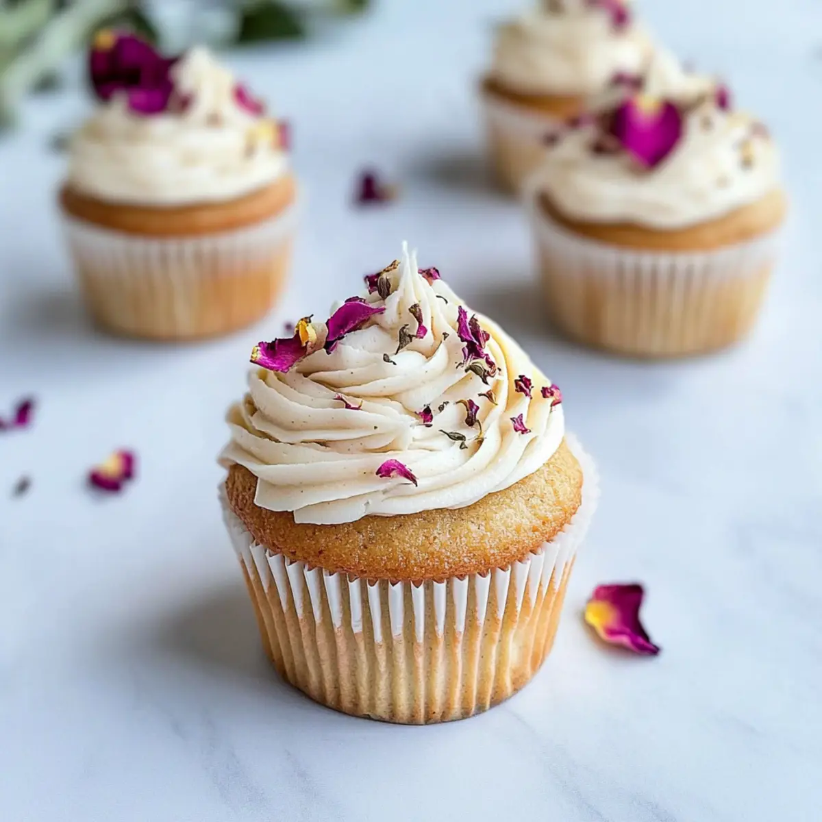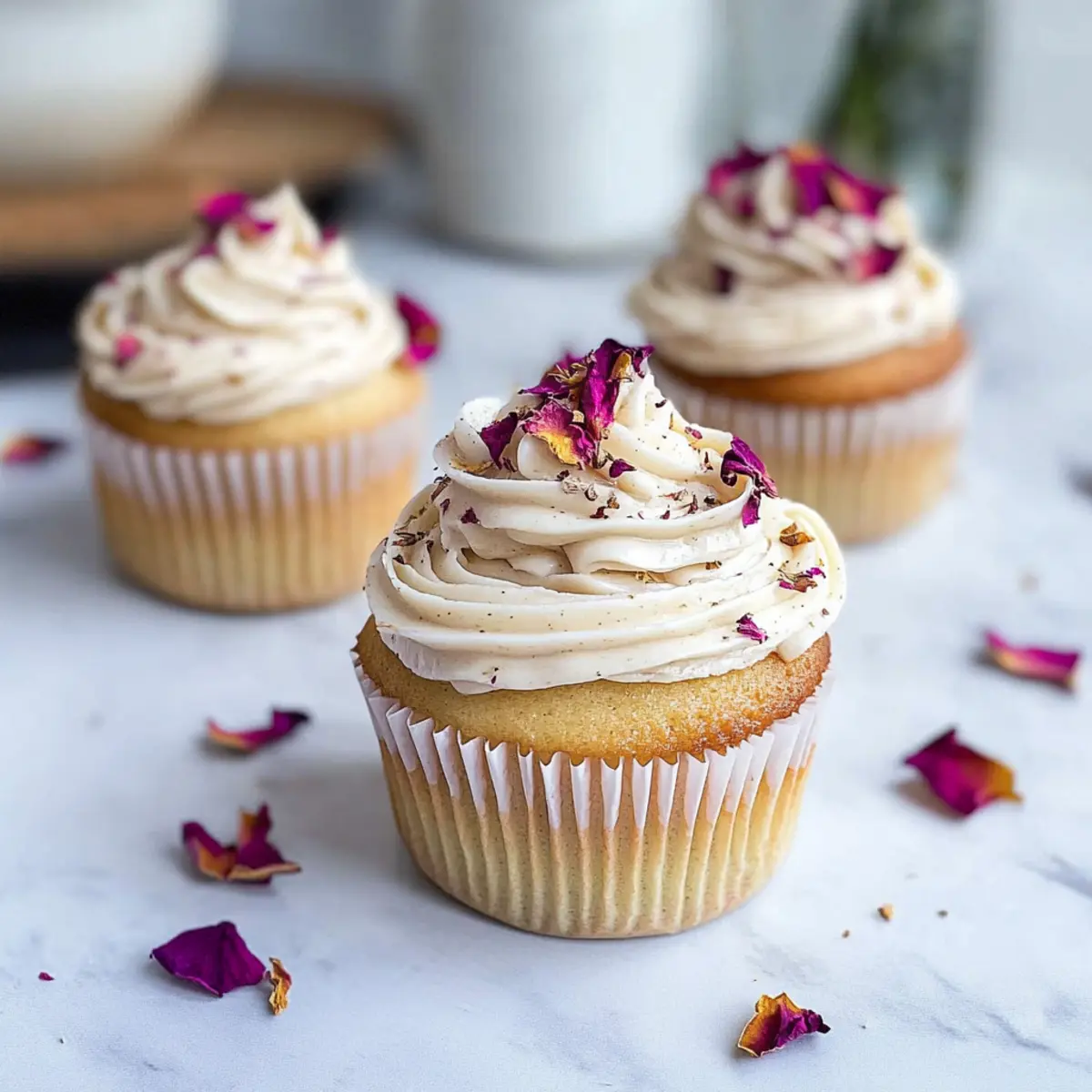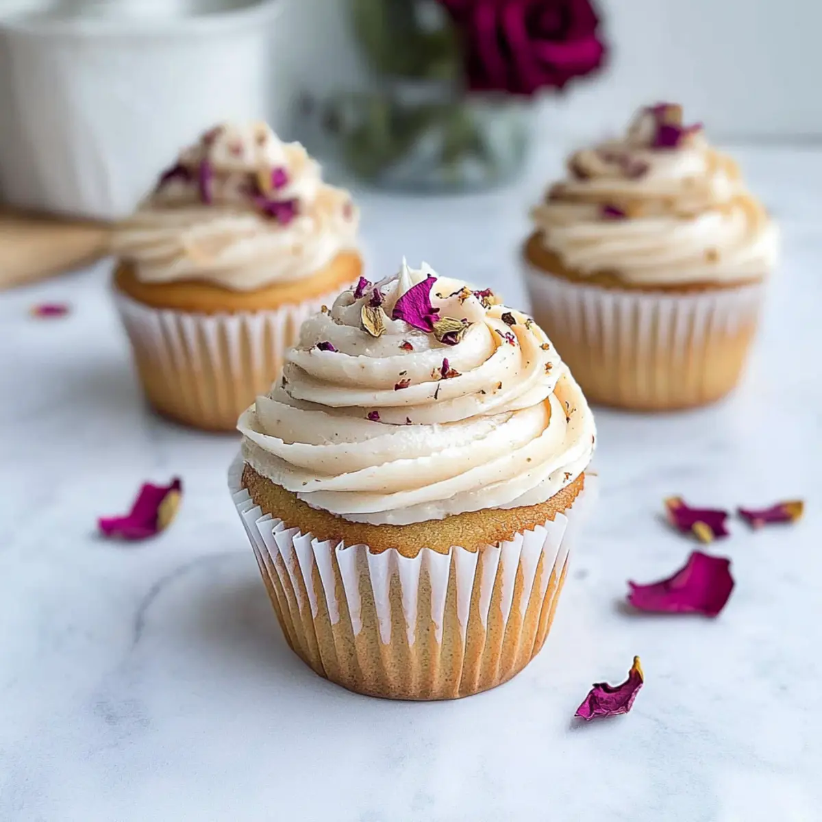 As I stood in my kitchen, the aromatic blend of cardamom danced through the air, instantly transporting me to a serene spice market. It was a cue for a delightful baking adventure with my Vegan Cardamom Rose Cupcakes. This charming dessert beautifully combines the warm, earthy notes of cardamom with the delicate, floral essence of rosewater, making it a perfect treat for any occasion. Not only are these cupcakes incredibly fluffy and moist, but they are also completely eggless and dairy-free. Plus, the magic lies in their one-bowl preparation—meaning quicker cleanup and more time to enjoy the sweet results! Whether you’re celebrating a special moment or simply indulging in a midday treat, these cupcakes are sure to impress. Are you ready to elevate your dessert game? Why Will You Love These Cupcakes? Fluffy and Delicious: Each Vegan Cardamom Rose Cupcake is incredibly moist and airy, making every bite a delight. Effortless Baking: The one-bowl method means less mess and more time savoring your creations, perfect for those last-minute celebrations. Unique Flavor Pairing: The warm cardamom flavor mingles beautifully with the floral notes of rosewater, giving you a bakery-quality dessert right at home. Customizable Variations: Want to switch things up? Try substituting vanilla for rosewater, or add a dash of cinnamon for a cozy twist! Crowd-Pleaser: These cupcakes are perfect for any occasion, from birthdays to elegant tea parties, sure to impress family and friends. For an even more delightful experience, check out these Garlic Rosemary Focaccia ideas to accompany your sweet treats! Vegan Cardamom Rose Cupcake Ingredients For the Cupcake Batter • ¾ cup oat/almond milk – Provides moisture and serves as a dairy substitute for a light texture. • ⅔ cup sugar – Adds sweetness; feel free to adjust based on your taste preference. • 3 tablespoons olive oil (or any liquid oil) – Adds fat for moisture; can substitute with canola oil if desired. • 2 teaspoons vanilla bean paste (or vanilla extract) – Imparts deep flavor; use extract if you don’t have the paste. • 1 ¼ cup pastry flour – This is key for structure; all-purpose flour can be substituted (1 cup + 2 tablespoons cornstarch). • ½ teaspoon salt – Essential for enhancing all flavors. • ½ teaspoon cardamom – This gives the cupcakes their signature warm spice; adjust to your taste. • ½ teaspoon baking powder – A leavening agent ensuring the right rise. • ¼ teaspoon baking soda – Works with acid to boost the cupcakes’ fluffiness. For the Frosting • ½ cup vegan butter – The base of your frosting; any dairy-free butter will work well. • ¼ cup shortening – Adds stability to the frosting; can be omitted for a lighter version if using all butter. • 1 teaspoon vanilla bean paste (or extract) – Enhances the frosting’s flavor profile. • ½ teaspoon rosewater – Infuses a floral note; adjust depending on preference or consider omitting. • 1 ½ cups powdered sugar – For sweetness and a smooth texture in frosting; more can be added for extra sweetness. • 2 tablespoons dried rose petals (optional) – A lovely decorative topping that adds an elegant touch. With these simple, wholesome ingredients, your Vegan Cardamom Rose Cupcakes will not only taste divine but also be a wonderful conversation starter at your gatherings! Step‑by‑Step Instructions for Vegan Cardamom Rose Cupcakes Step 1: Preheat the Oven Begin by preheating your oven to 350°F (180°C). While it heats up, prepare a muffin tin by lining it with cupcake liners to ensure easy removal after baking. This step is crucial for achieving the perfect rise in your Vegan Cardamom Rose Cupcakes, so set a timer to ensure it reaches the right temperature. Step 2: Mix Wet Ingredients In a large mixing bowl, whisk together ¾ cup of oat or almond milk, ⅔ cup of sugar, 3 tablespoons of olive oil, and 2 teaspoons of vanilla bean paste until fully combined. The mixture should be smooth and well-blended, creating a cozy foundation for your cupcakes. This one-bowl method makes it easy to whip up a delightful treat with minimal cleanup. Step 3: Combine Dry Ingredients Sift together 1 ¼ cups of pastry flour, ½ teaspoon of salt, ½ teaspoon of cardamom, ½ teaspoon of baking powder, and ¼ teaspoon of baking soda into the wet mixture. Gently fold the dry ingredients into the wet ones until just combined, avoiding overmixing to keep the batter fluffy. Your batter should be smooth and free of lumps, ready to create those airy Vegan Cardamom Rose Cupcakes. Step 4: Fill the Muffin Tin Carefully fill each cupcake liner about ¾ full with the prepared batter. This ensures that your cupcakes have room to rise nicely in the oven without spilling over. Place the filled muffin tin in the preheated oven and bake for 20-23 minutes. You’ll know they’re ready when a toothpick inserted into the center comes out clean. Step 5: Cool the Cupcakes Once baked, remove the muffin tin from the oven and allow the cupcakes to cool for 5 minutes. This resting period will help them firm up slightly. After that, carefully transfer the cupcakes to a wire rack to cool completely. Make sure they are fully cooled before frosting, ensuring the frosting stays beautifully intact. Step 6: Prepare the Frosting In a mixing bowl, beat together ½ cup of vegan butter and ¼ cup of shortening until light and fluffy. This will create a creamy base for your frosting, enhancing the flavors. Gradually add 1 teaspoon of vanilla bean paste and ½ teaspoon of rosewater, blending until fully incorporated. The mixture should be airy and aromatic, embodying the essence of your Vegan Cardamom Rose Cupcakes. Step 7: Add the Powdered Sugar Gradually sift in 1 ½ cups of powdered sugar, mixing continuously until you reach your desired consistency. This step is crucial for achieving the fluffy texture of the frosting while ensuring it’s sweet enough to complement the spiced cupcakes.